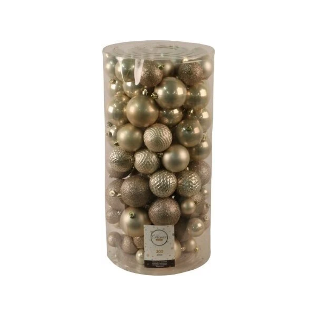 Creëer een sfeervolle kerst met een kerstboom vol prachtige kerstballen. Deze set van 100 onbreekbare kerstballen bestaat een divers aanbod van verschillende soorten kerstballen welke perfect op elkaar aansluiten. Erg leuk ter decoratie in de kerstboom of als accenten op een andere plek in huis.