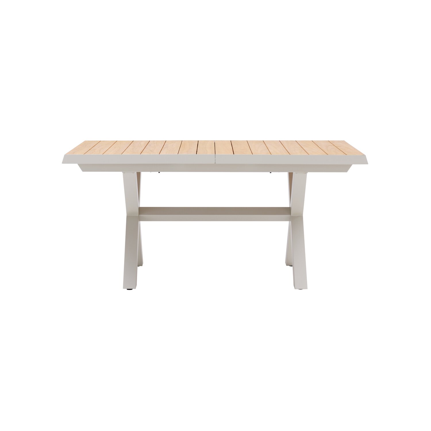 Het teakhouten tafelblad straalt natuurlijke schoonheid uit en nodigt uit tot onvergetelijke diners onder de sterrenhemel. Het beige aluminium frame voegt een vrolijke eigentijdse touch toe en belooft jarenlang plezier. Schuif de tafel uit en creëer een feestelijke sfeer voor al je vrienden en familie.