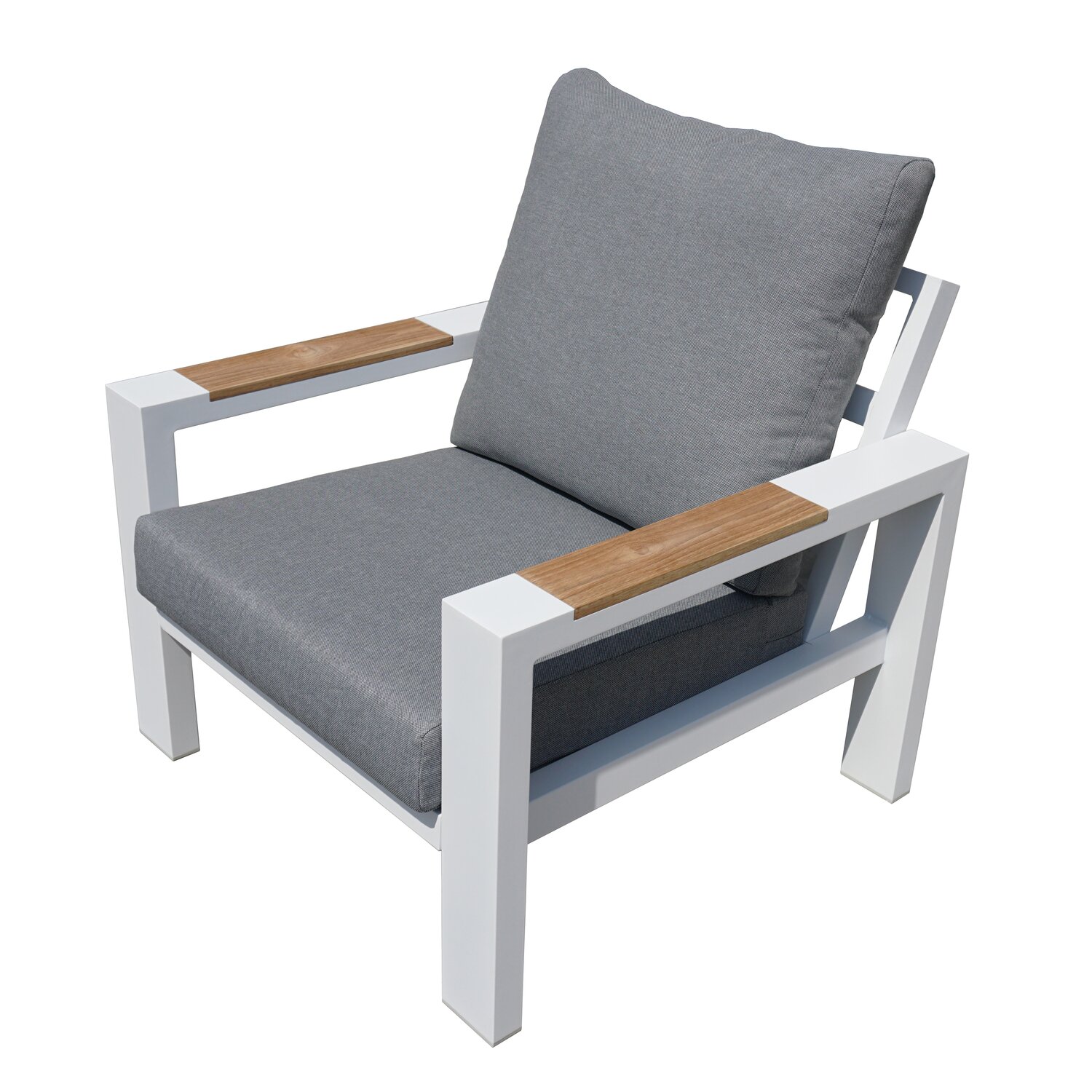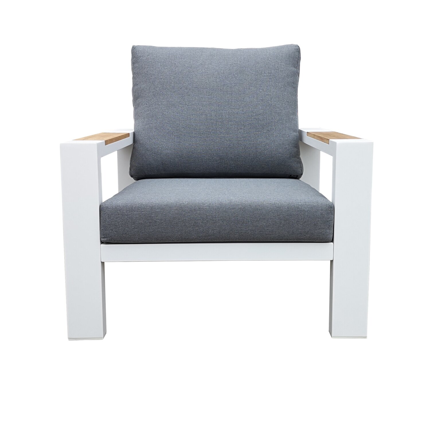 Het elegante ontwerp, met een frame van wit aluminium, geeft je buitenruimte een frisse, inspirerende uitstraling. De teakhouten armleggers voegen een natuurlijk element toe dat je tuin doet stralen. De grijze kussens, naast hun visuele aantrekkingskracht, omarmen je met hun zachtheid en comfort en nodigen uit tot ontspannen momenten.