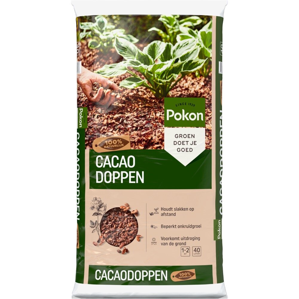 Pokon Cacaodoppen is een decoratieve bodembedekker die ideaal is voor gebruik in de border. Het is gemaakt van cacaodoppen die overblijven na de verwerking van cacaobonen en bestaat dus voor 100% uit natuurlijke bestandsdelen. Door met dit decoratieve product je border te bedekken, kan de zon niet direct op de grond schijnen. De grond droogt daardoor minder snel uit. Bovendien houden cacaodoppen slakken op afstand door de structuur van de doppen en geeft het onkruid minder houvast.