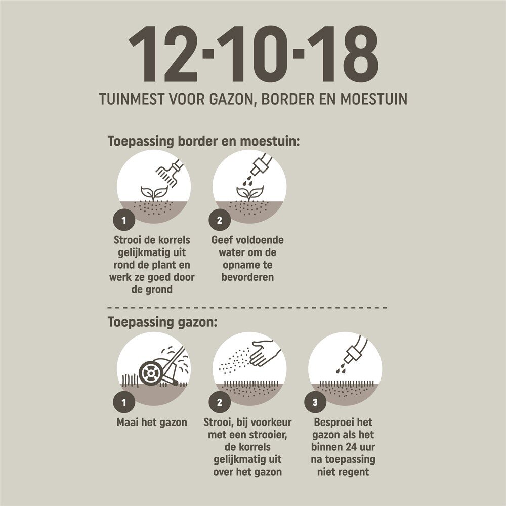 Toepassing border en moestuin: strooi de korrels gelijkmatig uit rond de plant en werk ze goed door de grond. Geef voldoende water om de opname te bevorderen.