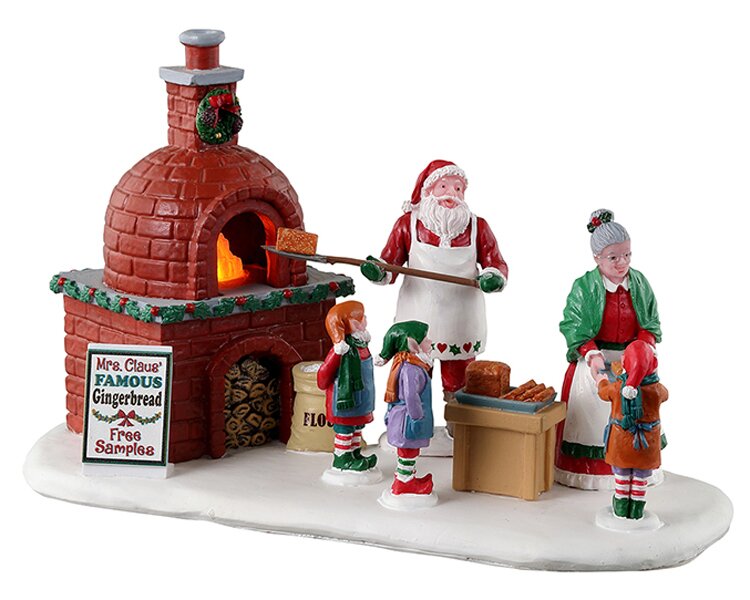 Een week of twee voor Kerstmis vang je de geur van gemberkoekjes op die door de lucht zweeft in de stad. Volg je neus naar "Mrs. Claus' Gingerbread Bake" van Lemax. Met behulp van een geheim recept en een met de hand gebouwde oven speciaal voor gemberkoekjes, richten zij en de Kerstman hun winkel op in de buurt van het centrum van de stad, zodat iedereen kan genieten van deze bijzondere feestlekkernij. Deze charmante scшne belichaamt de ambachtelijke sfeer en de warme tradities van de feestdagen, en nodigt uit om de heerlijke geur van versgebakken gemberkoekjes te volgen en de gezelligheid van het seizoen te proeven in het betoverende kerstdorp.