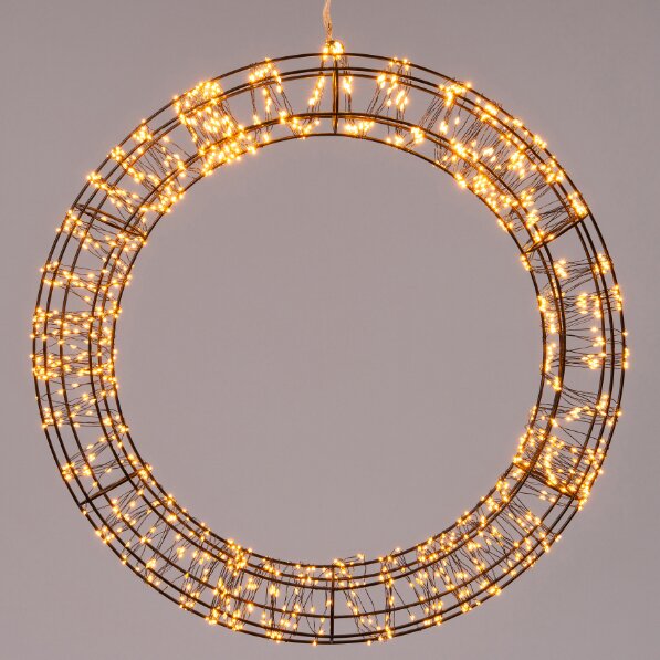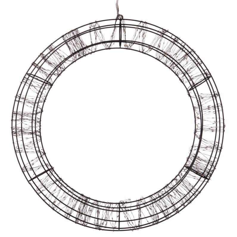 Deze metalen krans heeft een diameter van 56 cm en bevat 1200 lampjes voor een rijk lichtbeeld. Geschikt voor decoratie in grote ruimtes.