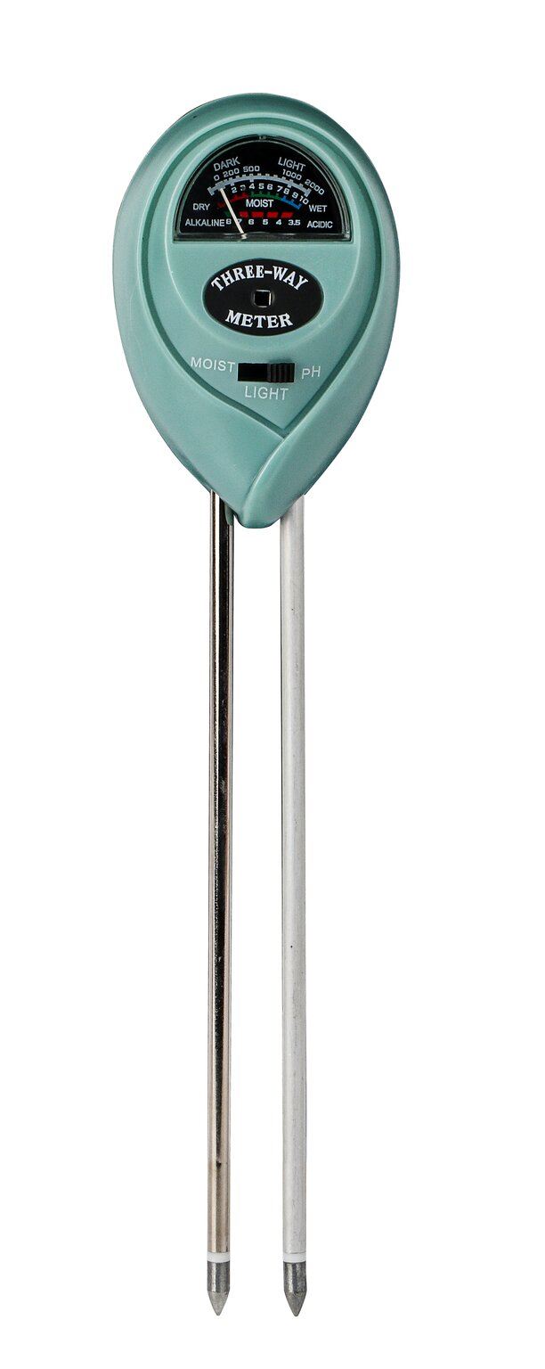 De ideale tool om de juiste omgeving voor je plant te vinden, deze meter controleert namelijk het vochtgehalte van de bodem, de licht intensiteit en de pH-waarde. Simpelweg in de grond steken, de juiste functie selecteren en de waarde aflezen. Geen batterij benodigd.