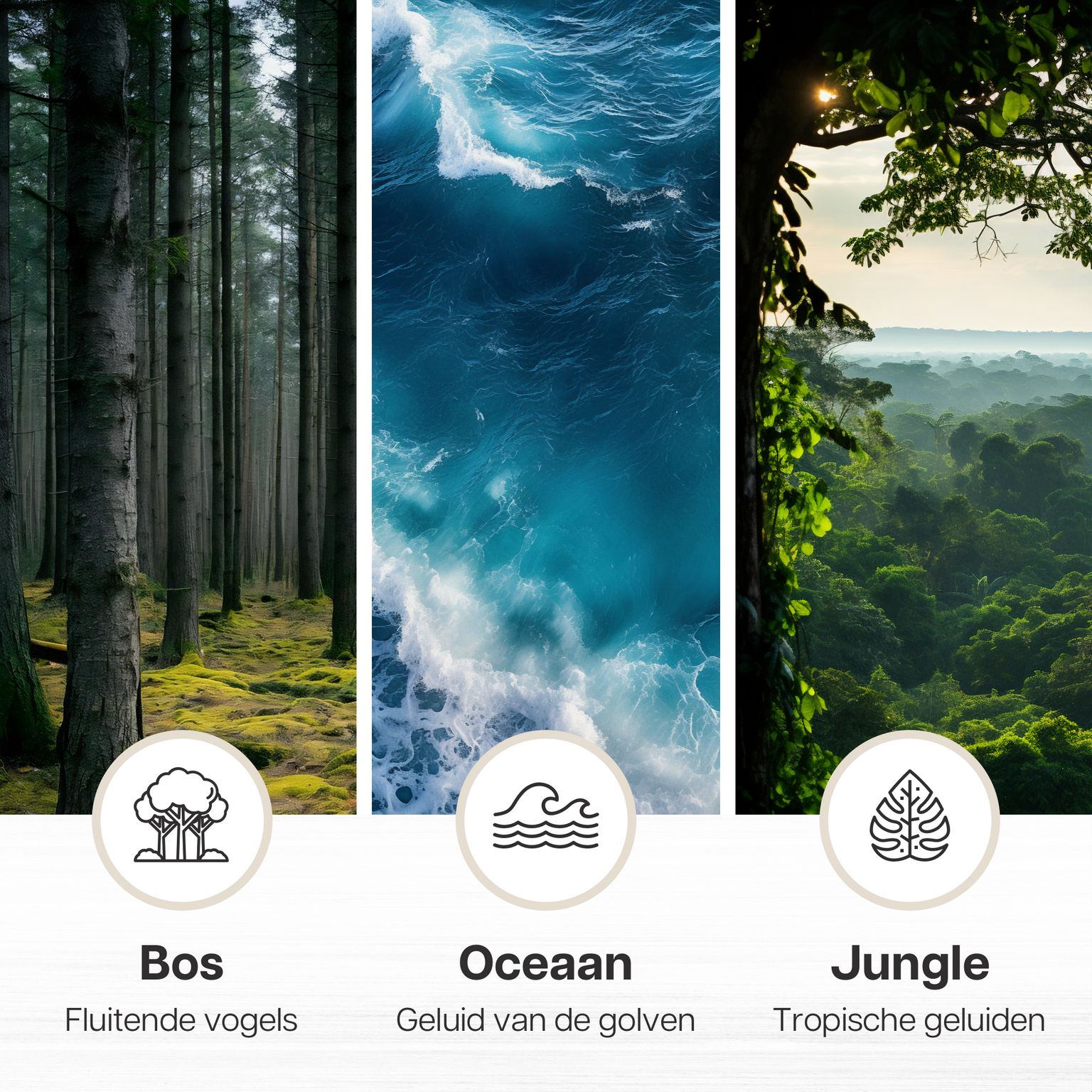 * Vier rustgevende natuurgeluiden: vogels, oceaan, jungle en bos