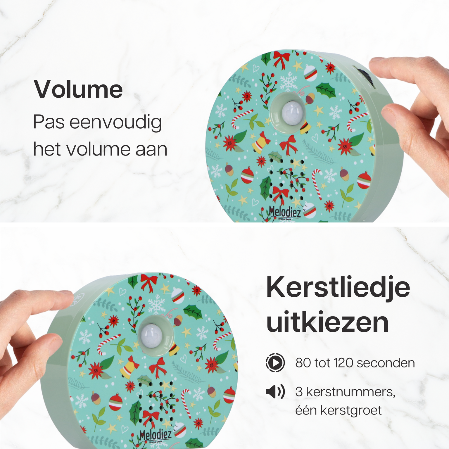 Stof de geluidsbox regelmatig af met een droge doek om de kerstprints mooi te houden. Bewaar de Melodiez na de feestdagen op een droge plek en haal de batterijen eruit om lekkage te voorkomen. Zo geniet je elk jaar opnieuw van de magische kerstsfeer!