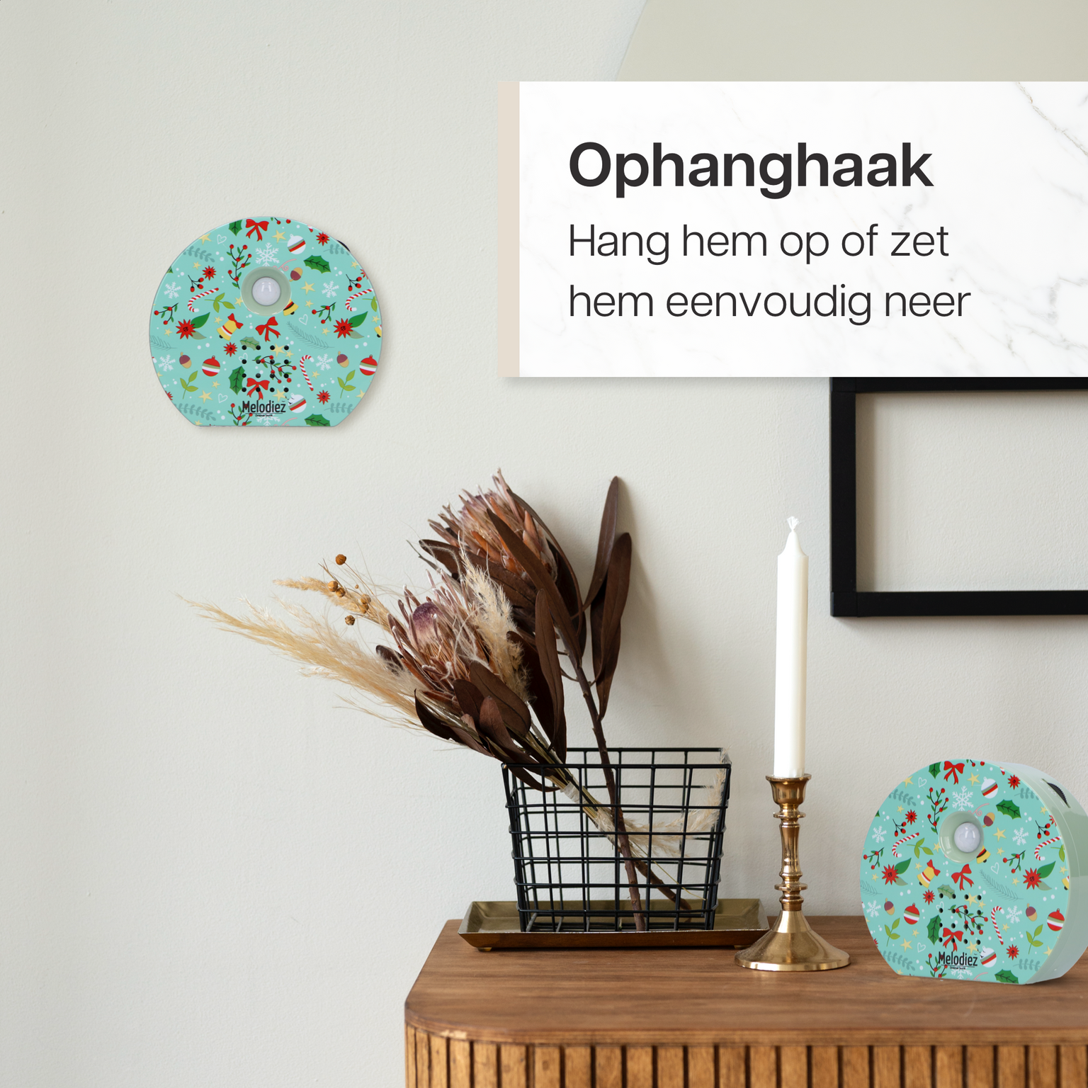 De Melodiez Christmas Edition is dé sfeermaker voor de feestdagen. Deze compacte geluidsbox combineert hartverwarmende kerstliedjes met de iconische groet van de kerstman: “Ho ho ho, Merry Christmas!”. Of je nu thuis bent, op kantoor of in je winkel: met één druk op de knop breng je direct een vleugje kerstmagie in elke ruimte. De Melodiez is stijlvol vormgegeven met vier sfeervolle kerstprints en verspreidt dankzij de bewegingssensor automatisch betoverende klanken zodra iemand binnenkomt. Compleet geleverd met batterijen, dus direct klaar voor gebruik!