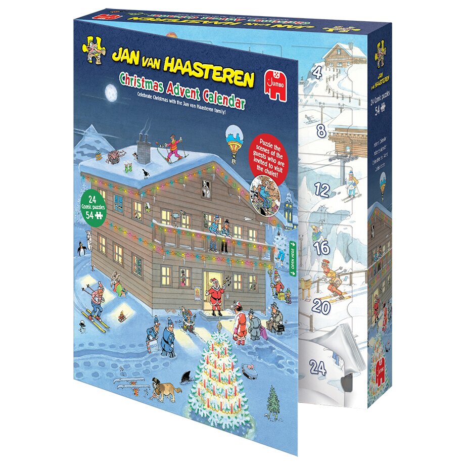 Deze kalender is niet zomaar een aftelkalender, maar een dagelijkse dosis plezier voor jong en oud. Met 24 unieke puzzels ontdek je telkens een ander scène in het winterse chalet, waar de Jan van Haasteren familie zich weer van hun mafste kant laat zien. Het formaat van 54 stukjes per puzzel is perfect voor een kort, ontspannend moment in de drukke decembermaand. Ideaal voor gezinnen, puzzelfans én als origineel cadeau.