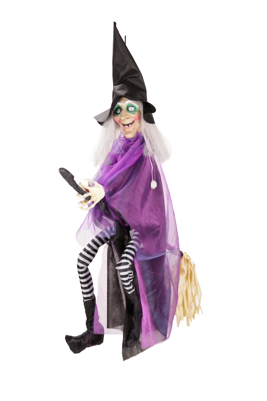 Halloween bewegende animatiepop Heks op bezemsteel H 90 cm