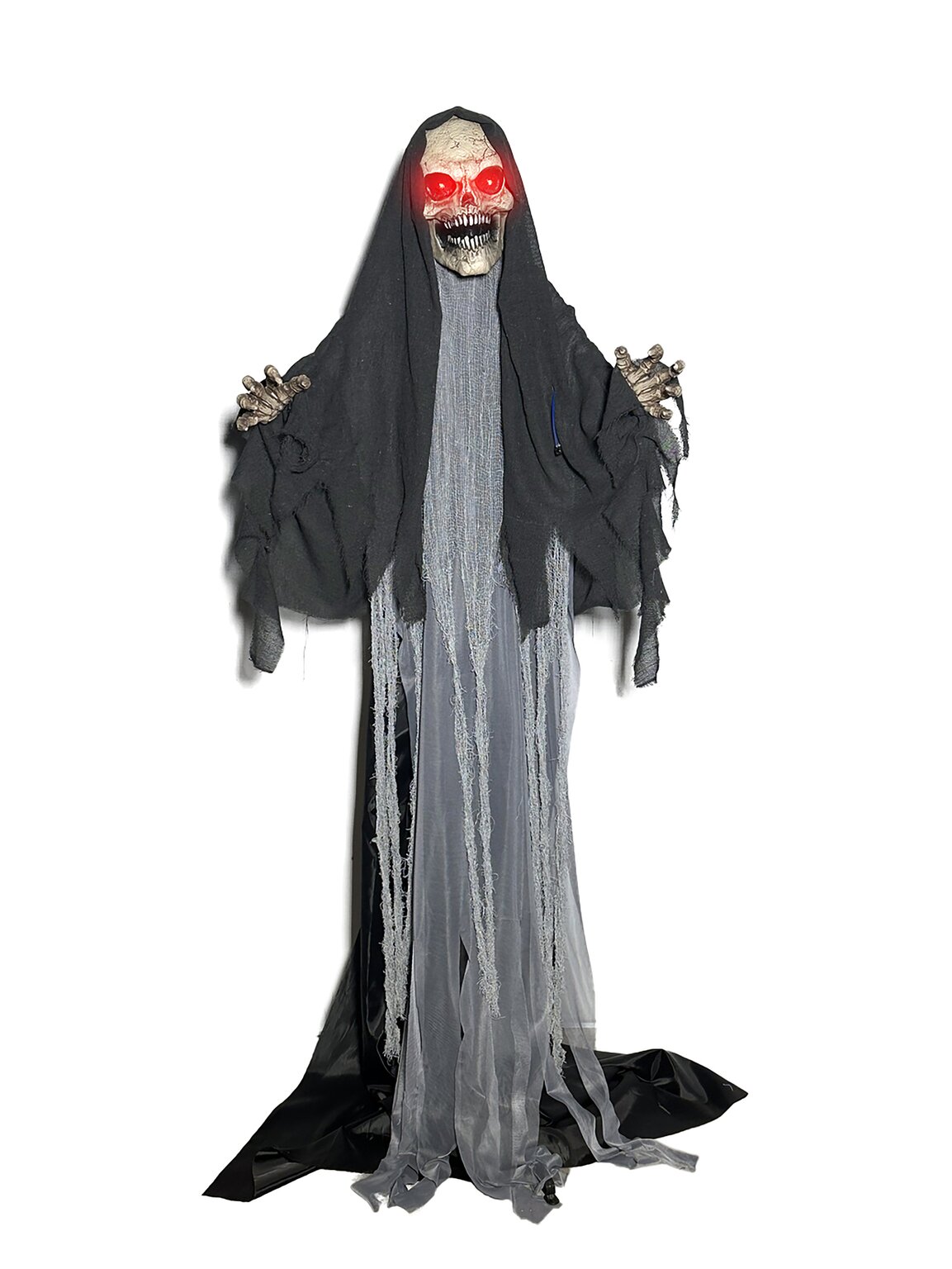 Deze Halloween bewegende animatiepop Skelet staand H 180 - 240 cm is een reus onder de griezels. Deze kolossale verschijning torent dreigend boven alles en iedereen uit. En hij beweegt alsof hij net uit een eeuwenoud graf is opgestaan - klaar om je gasten de rillingen te bezorgen!