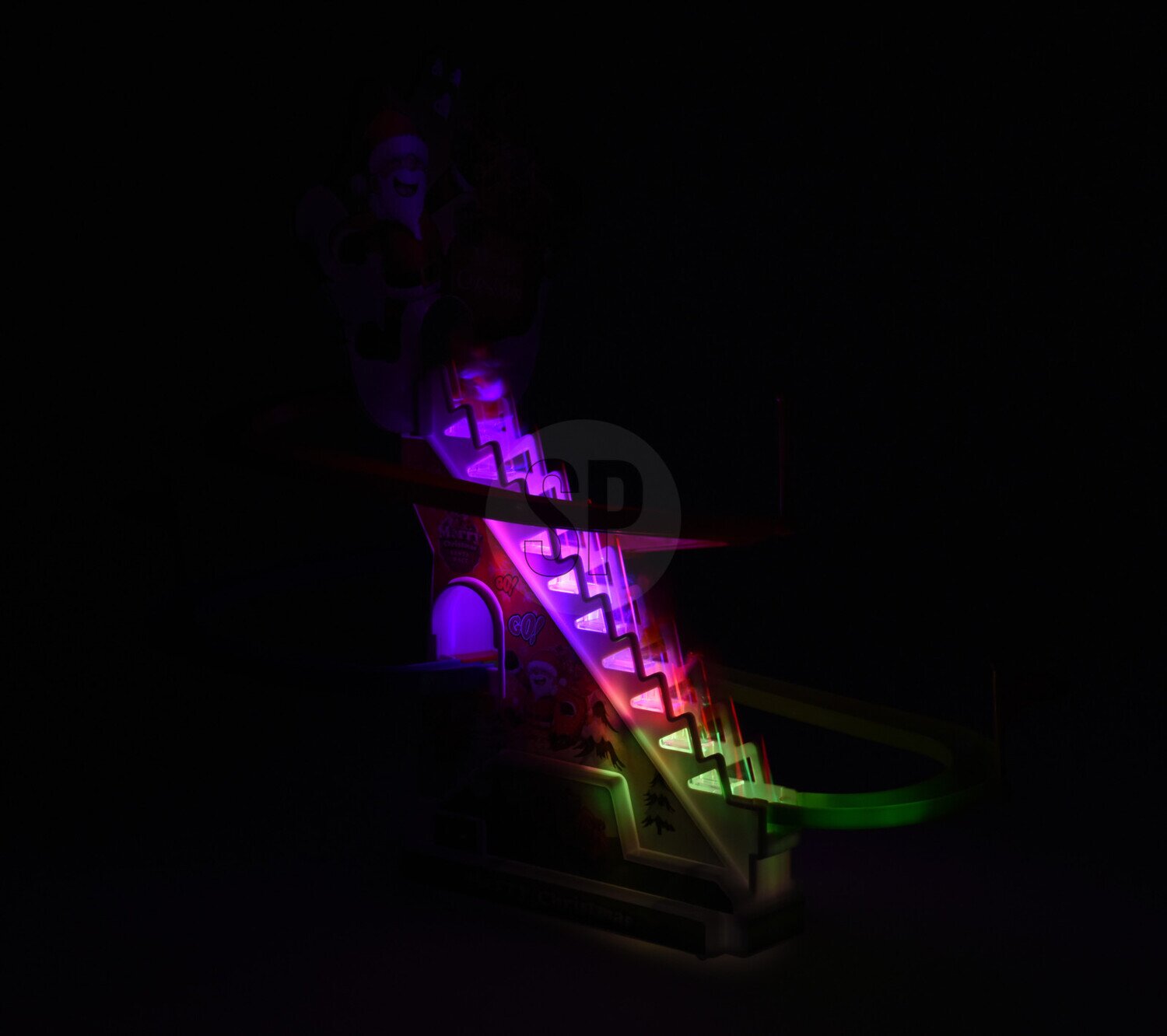 Met deze vrolijke kerstspeelset beleef je eindeloos speelplezier in een winters wonderland. Kleine kerstmannetjes racen naar beneden over kleurrijke baantjes, klimmen automatisch weer omhoog via de trap en beginnen dan opnieuw – onder begeleiding van lichtjes en vrolijke kerstmuziek!