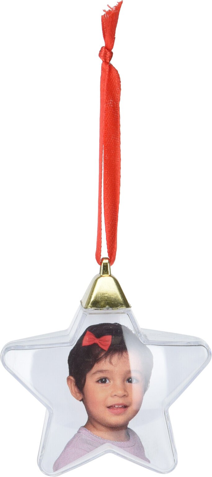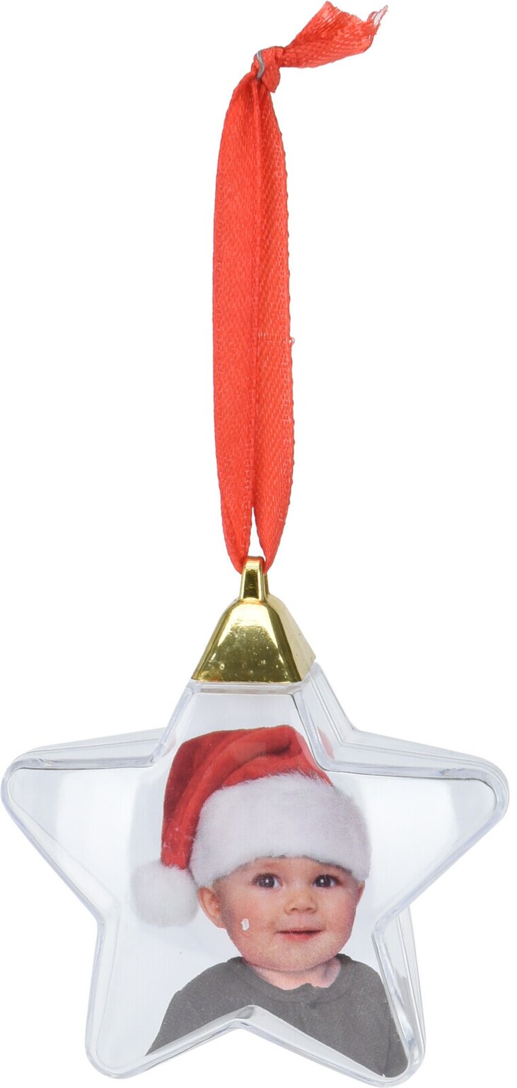 Breng warmte en een persoonlijke touch in je kerstboom met deze vrolijke kerstornamenten waarin je je eigen foto kunt plaatsen. Verkrijgbaar in de vorm van een ster of klassieke kerstbal (Ø 7 cm), zijn deze decoraties perfect om je gezin, huisdieren of dierbare herinneringen een ereplekje in de boom te geven.