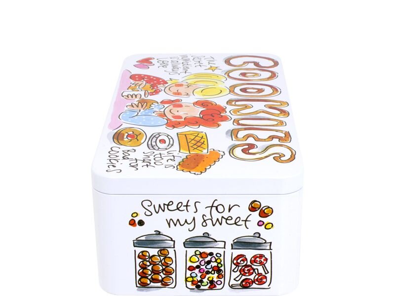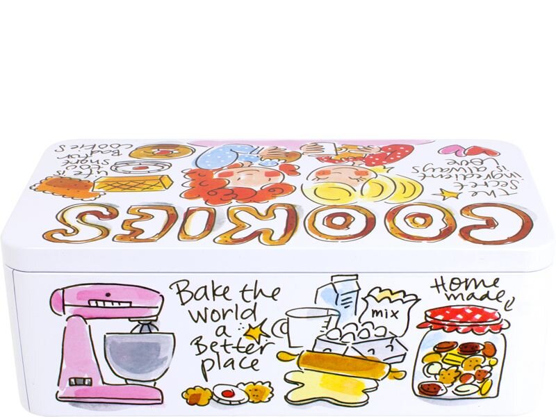 Klein koekblik uit de Even Bijkletsen collectie met vrolijke quotes en illustraties.