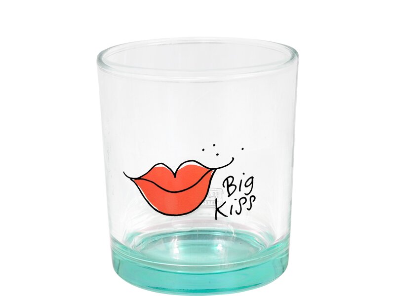 Een glas vol liefde? Daar hoort het Big Kiss sapglas van Blond Amsterdam bij. Dit glas uit de Even Bijkletsen-collectie heeft een frisse mintkleurige bodem, een vrolijke lippenprint en de tekst 'Big Kiss'.