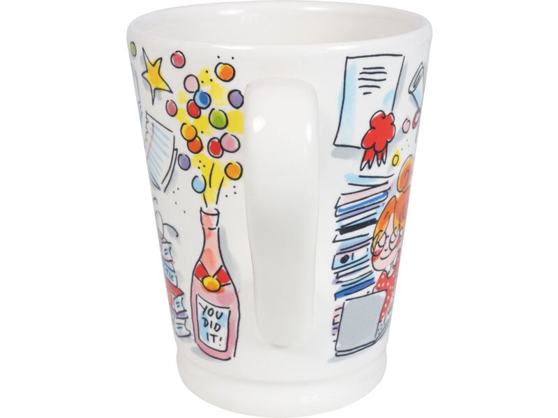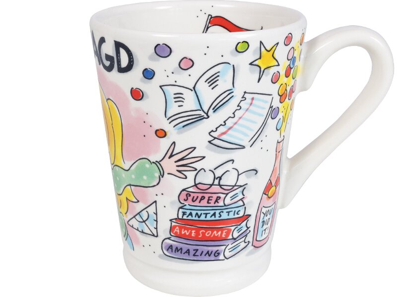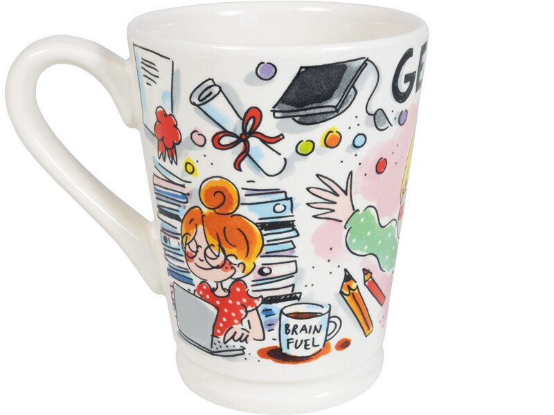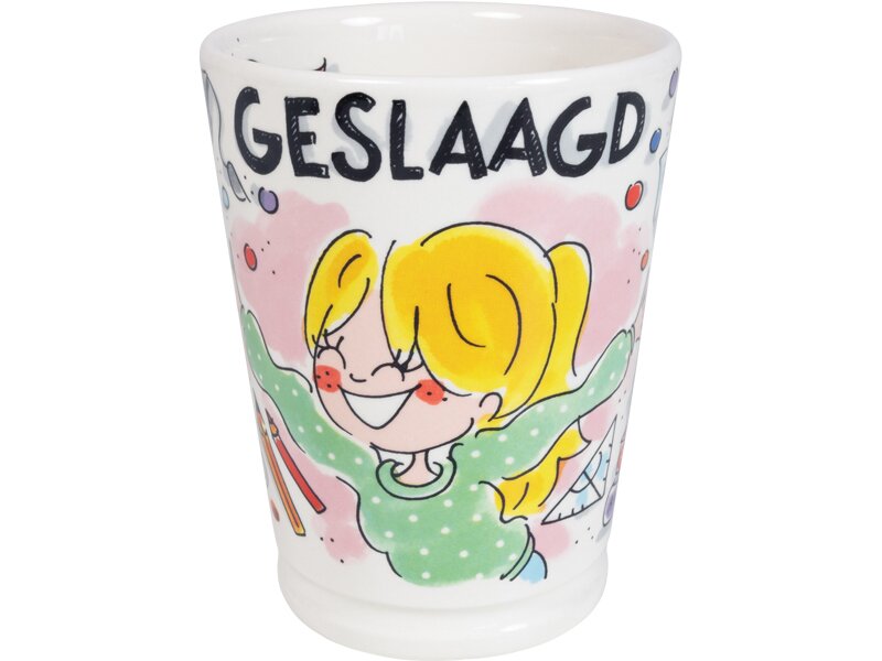 Blije beker met “Geslaagd”-illustraties. Perfect cadeau voor elke geslaagde.