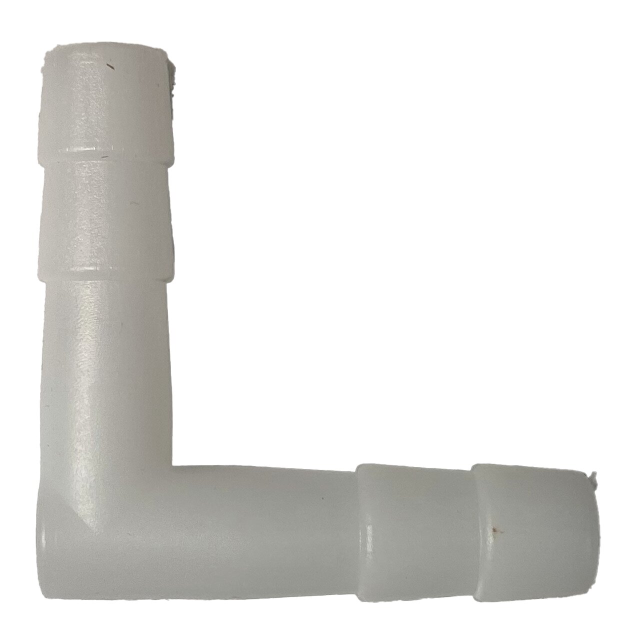 Elleboogkoppeling voor het maken van een haakse slangverbinding.\n\n• Geschikt voor slangen van 9/12 mm\n• Voorkomt knikken van de slang\n• Duurzaam kunststof