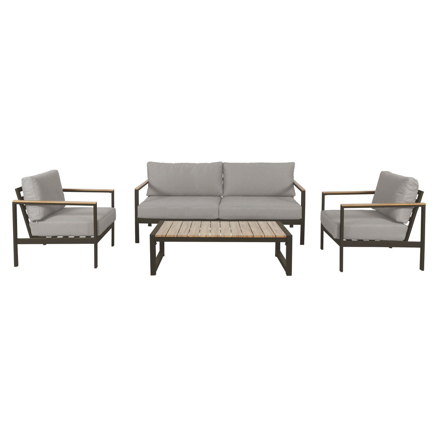 De set bestaat uit een royale bank (L 165 x B 75 x H 71 cm), twee comfortabele stoelen (L 75 x B 69 x H 71 cm) en een praktische salontafel (L 110 x B 60 x H 32 cm). Het aluminium frame in een diepe, donkere espresso-kleur vormt een stevige, stabiele basis, terwijl de houtlook-details op de leuningen en het tafelblad een natuurlijke, warme uitstraling toevoegen. De grijze polyester kussens zijn zacht, comfortabel en onderhoudsvriendelijk, waardoor je urenlang kunt relaxen zonder concessies te doen aan stijl of gemak.