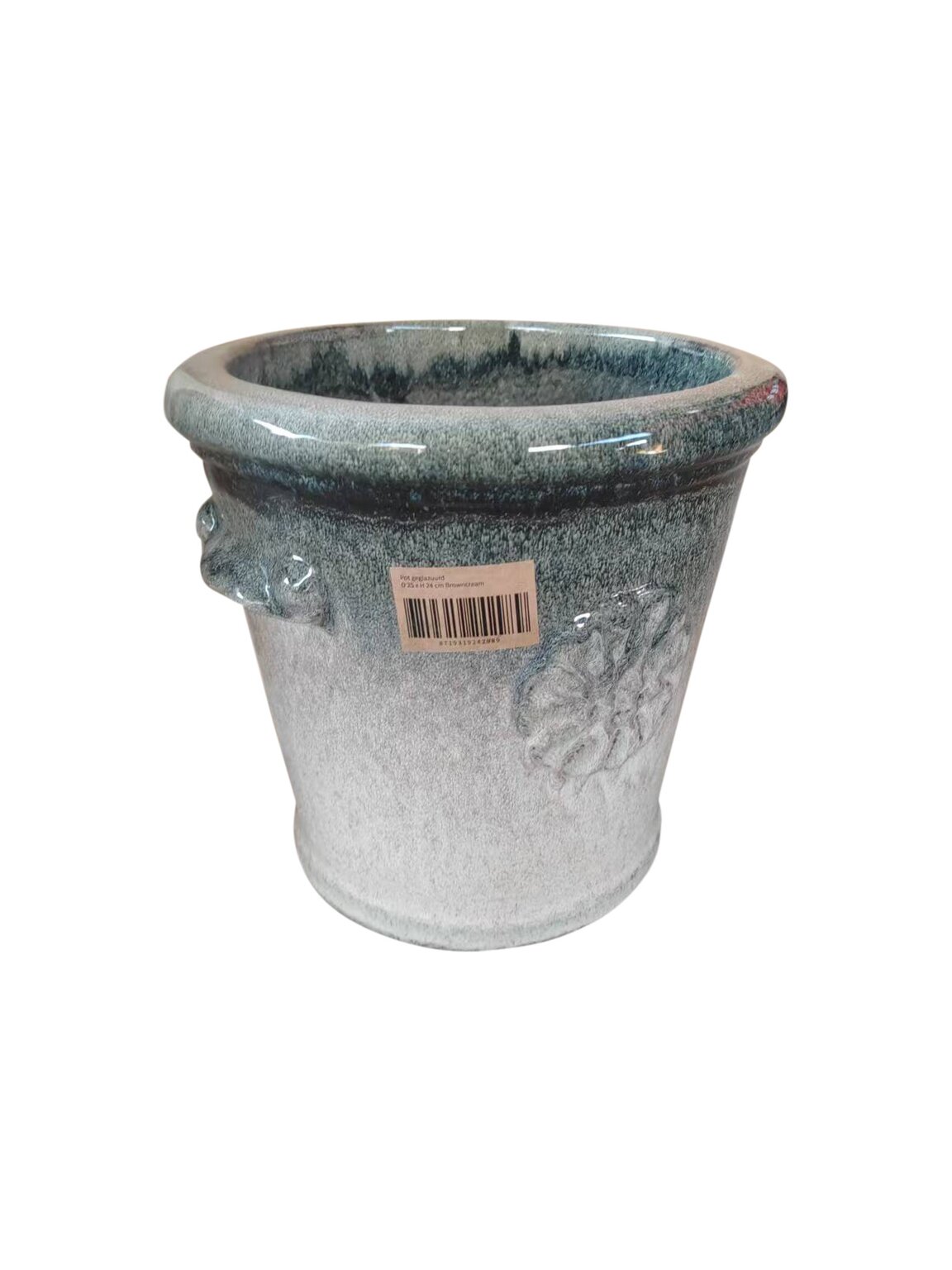 - Technische kenmerken: geglazuurd, klein rond model, reliëf en decoratieve grepen