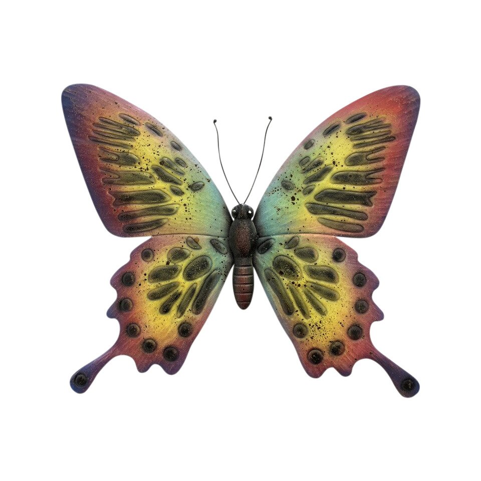 De Muurvlinder 56 x 48 cm multi is een speelse metalen decoratie die je tuin, balkon of terras een kleurrijk en vrolijk detail geeft. Met een formaat van 56 x 48 cm is deze vlinder groot genoeg om een opvallend accent te vormen, maar nog steeds flexibel te plaatsen tussen planten, bloemen of andere buitenaccessoires. Het robuuste, weerbestendige metaal zorgt dat hij het hele jaar door buiten kan blijven staan.