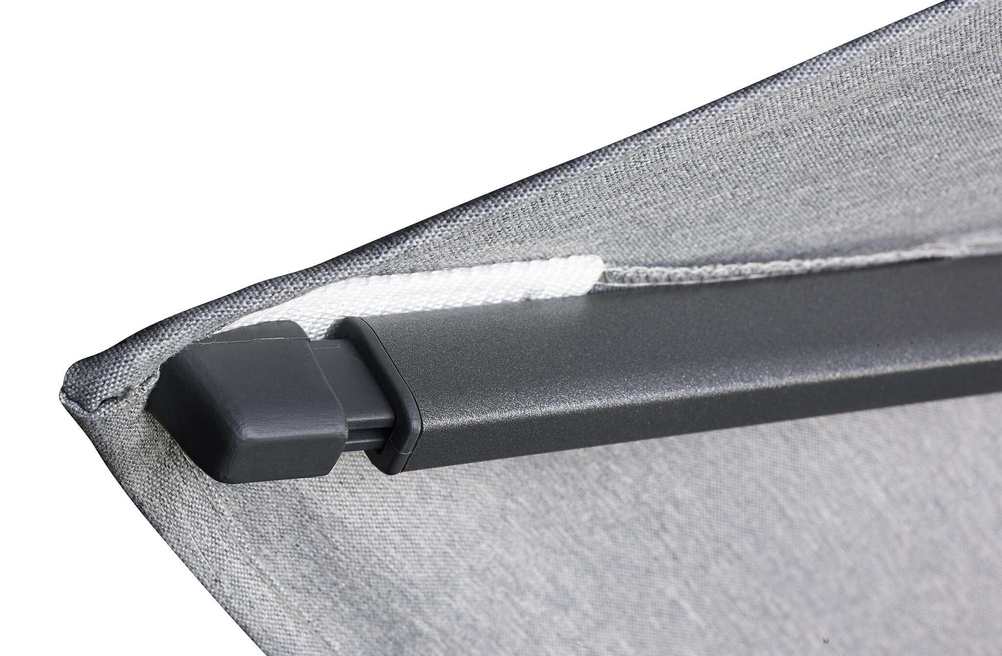 Het zware 300 grams polyester doek in de kleur antraciet blijft lang mooi en biedt goede bescherming tegen de zon; tot 96% UV protectie. Het doek is voorzien van water- en vuilafstotende coating en doekspanners.