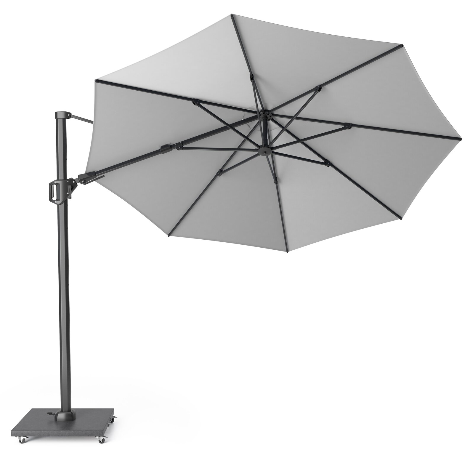 - De zweefparasol heeft een antraciet frame met een lichtgrijs doek