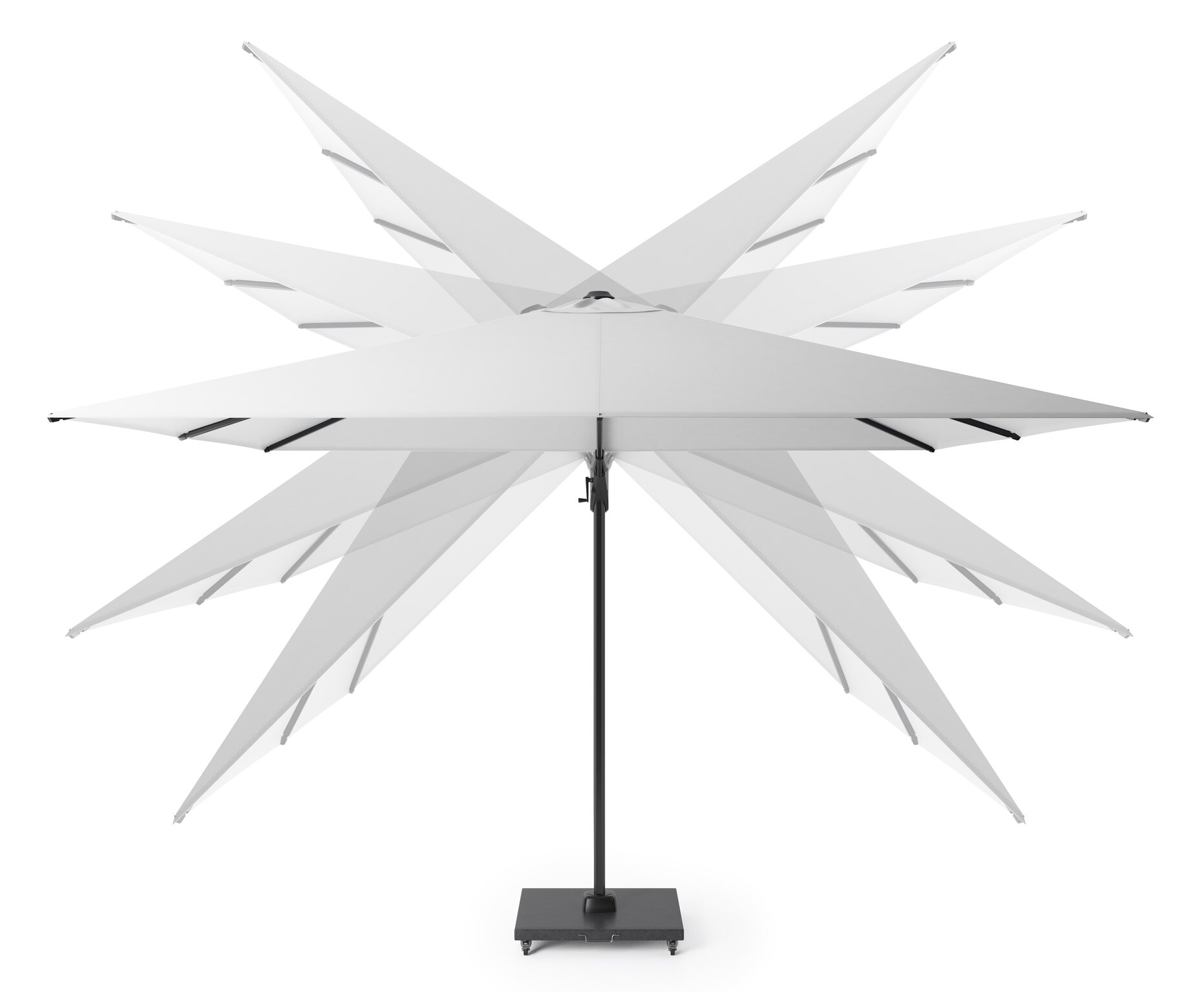 Geeft de gehele dag door schaduw zonder de parasol te verplaatsen door T² achterwaartse & zijwaartse kantelbaarheid en de 360° draaibare voet.