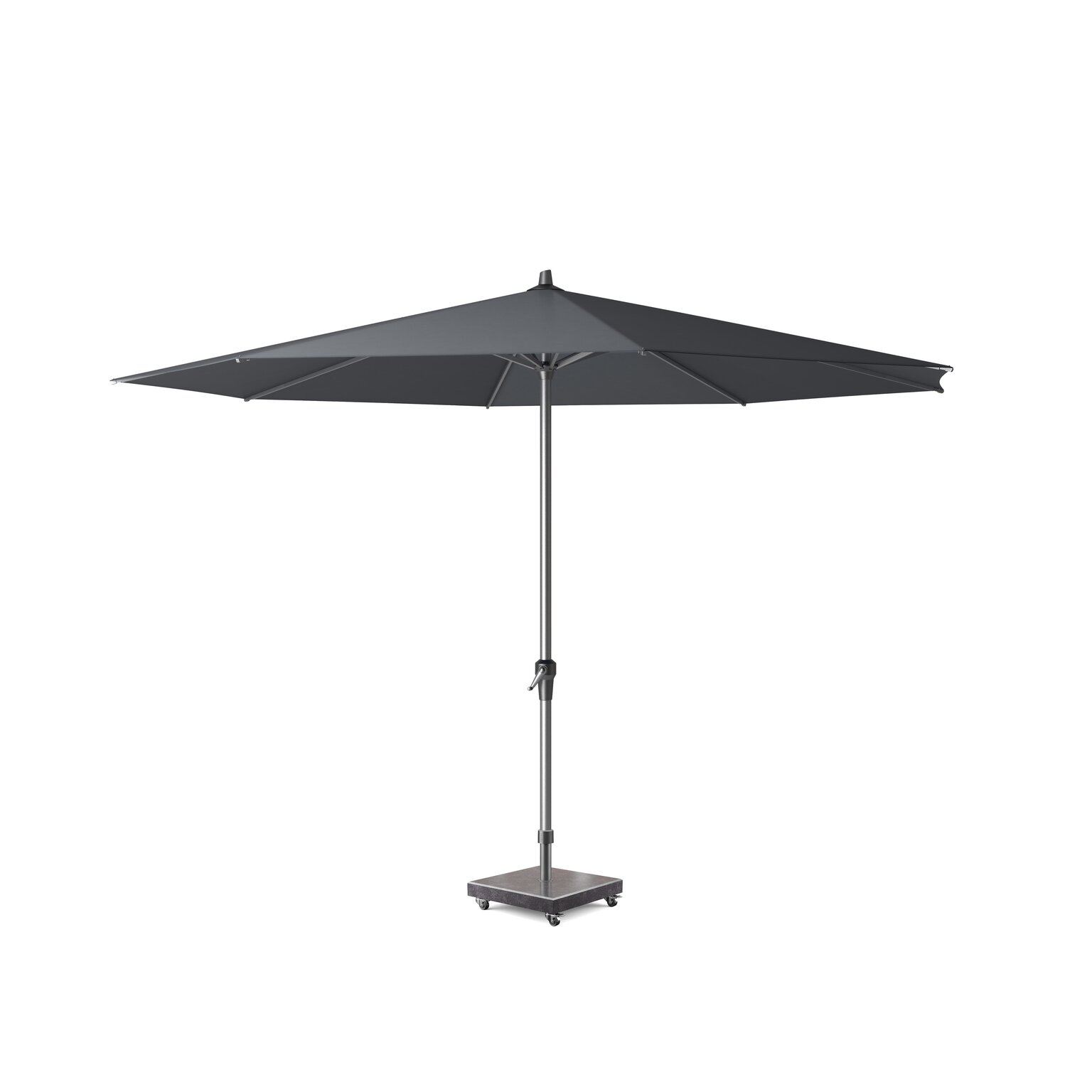 Platinum Sun & Shade middenstokparasol Riva Ø350 antraciet. Design| Modern strak design, mede door doekspanners. Gebruiksgemak| Eenvoudig te openen en sluiten door easy-up draaisysteem. Schaduwvlak| Makkelijk te plaatsen en te verplaatsen om overal schaduw te kunnen creëren. Doekkwaliteit| Het 220 grams polyester doek in de kleur antraciet blijft lang mooi en biedt een goede bescherming tegen de zon; tot 96% UV protectie. Het doek is voorzien van waterafstotende coating en doekspanners. Parasolvoet| De parasol wordt zonder voet geleverd. Wij adviseren deze parasol op een 40kg parasolvoet van Platinum Sun & Shade te plaatsen. Parasolhoes| Houd uw parasol als nieuw en dek deze af met een AeroCover ademende parasolhoes (art.nr. 7982) wanneer u deze langere tijd niet gebruikt.