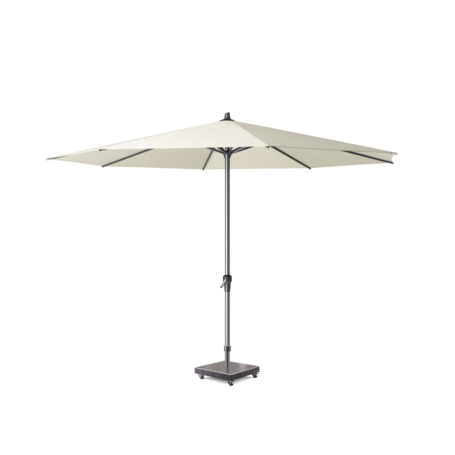 Platinum Sun & Shade middenstokparasol Riva Ø350 ecru. Design| Modern strak design, mede door doekspanners. Gebruiksgemak| Eenvoudig te openen en sluiten door easy-up draaisysteem. Schaduwvlak| Makkelijk te plaatsen en te verplaatsen om overal schaduw te kunnen creëren. Doekkwaliteit| Het 220 grams polyester doek in de kleur ecru blijft lang mooi en biedt een goede bescherming tegen de zon; tot 96% UV protectie. Het doek is voorzien van waterafstotende coating en doekspanners. Parasolvoet| De parasol wordt zonder voet geleverd. Wij adviseren deze parasol op een 40kg parasolvoet van Platinum Sun & Shade te plaatsen. Parasolhoes| Houd uw parasol als nieuw en dek deze af met een AeroCover ademende parasolhoes (art.nr. 7982) wanneer u deze langere tijd niet gebruikt.