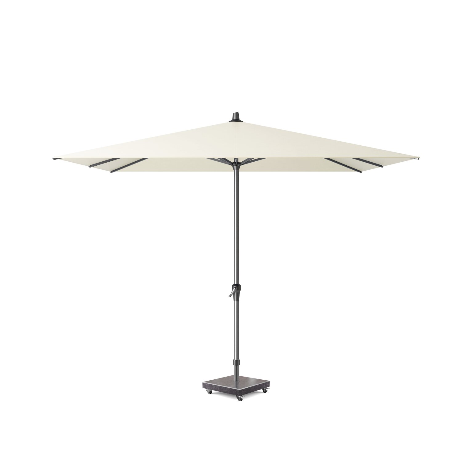 Platinum Sun & Shade middenstokparasol Riva 275x275 ecru. Design| Modern strak design, mede door doekspanners. Gebruiksgemak| Eenvoudig te openen en sluiten door easy-up draaisysteem. Schaduwvlak| Makkelijk te plaatsen en te verplaatsen om overal schaduw te kunnen creëren. Doekkwaliteit| Het 220 grams polyester doek in de kleur ecru blijft lang mooi en biedt een goede bescherming tegen de zon; tot 96% UV protectie. Het doek is voorzien van waterafstotende coating en doekspanners. Parasolvoet| De parasol wordt zonder voet geleverd. Wij adviseren deze parasol op een 60kg parasolvoet van Platinum Sun & Shade te plaatsen. Parasolhoes| Houd uw parasol als nieuw en dek deze af met een AeroCover ademende parasolhoes (art.nr. 7984) wanneer u deze langere tijd niet gebruikt.