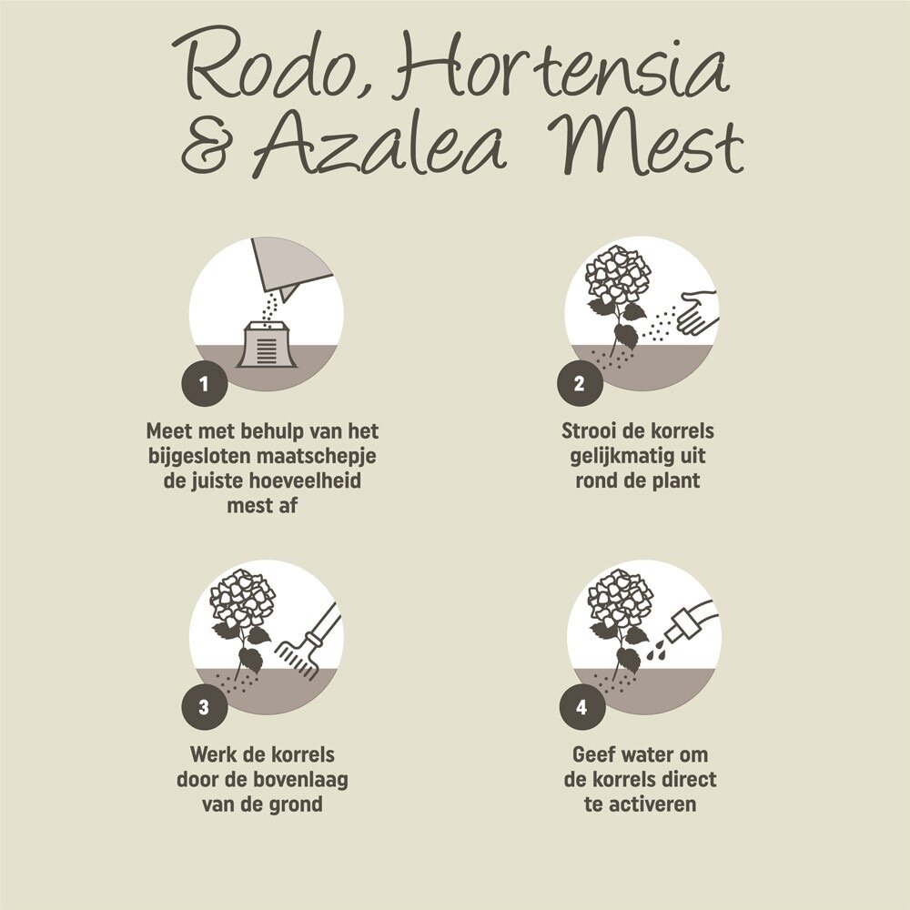 3-in-1 werking: voeding, bodemverbeteraar en plantversterker in 1 korrel. Pokon Rodo, Hortensia & Azalea Mest is geschikt voor zuurminnende planten zoals rododendron, hortensia, magnolia, azalea, camelia en acer. Deze organische mest, verrijkt met in de natuur voorkomende mineralen zoals zeoliet en algen, voedt de plant en verbetert de grond. Een goed bemeste en gezonde bodem is een belangrijke voorwaarde voor uitbundige bloei en gezonde planten. Door de extra toevoeging van Magnesium (Mg0) en IJzer (Fe) worden de bladeren diepgroen van kleur. De voeding en Pokon Plantenversterker zorgen voor sterke planten met een goede weerstand tegen ziektes, plagen en vorst. Pokon Rodo, Hortensia en Azalea Mest geeft tot wel 120 dagen voeding. Pokon Rodo, Hortensia & Azalea Mest kan in de maanden maart t/m september gebruikt worden. Voor het beste resultaat voed je je planten 2 keer per jaar, in het vroege voorjaar en in de zomer.