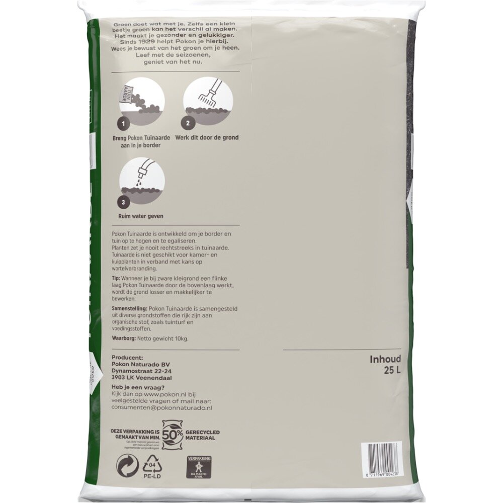 Pokon Tuinaarde is ontwikkeld om jouw border en tuin op te hogen en te egaliseren. Tuinaarde zorgt voor meer organische stof in de grond, waardoor wortels van jouw planten zich goed kunnen ontwikkelen. Zet jouw planten nooit rechtstreeks in tuinaarde, maar gebruik het in verband met kans op verbranding alleen om door de grond te mengen. Voor de aanplant van tuinplanten adviseren wij om Tuinplanten Aanplantgrond of een specifieke grond, zoals Rozen grond, te gebruiken. Pokon Tuinaarde is samengesteld uit diverse grondstoffen die rijk zijn aan organische stof, zoals tuinturf en voedingstoffen.