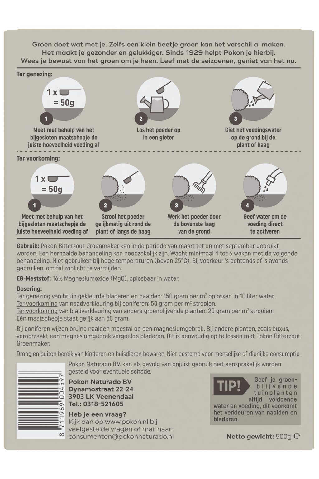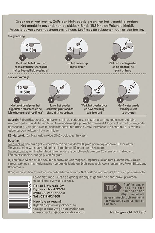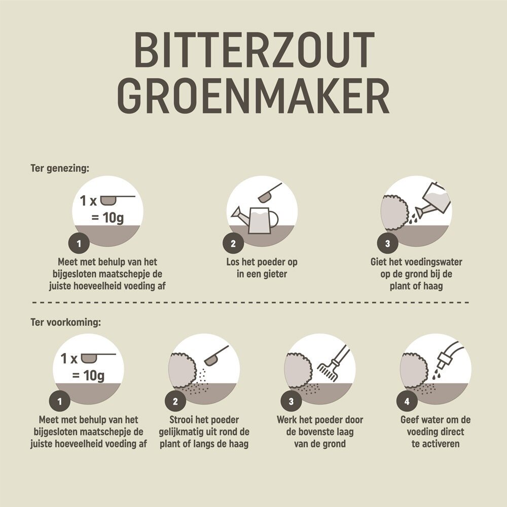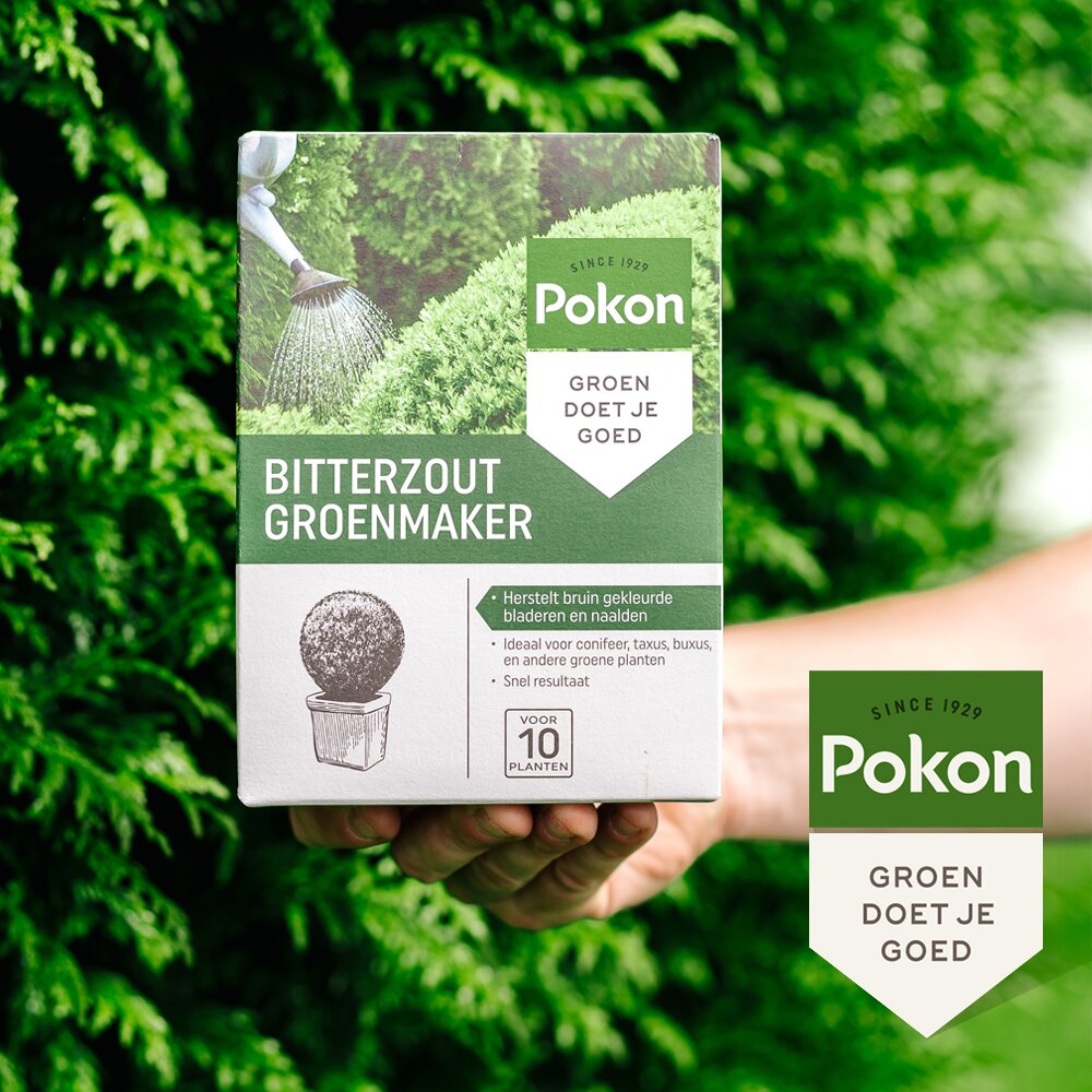 Bij coniferen wijzen bruine naalden meestal op een magnesiumgebrek. Bij andere planten, zoals buxus, veroorzaakt een magnesium gebrek vergeelde bladeren. Dit is eenvoudig op te lossen met Pokon Bitterzout Groenmaker. Pokon Bitterzout Groenmaker kan in de periode van maart t/m september gebruikt worden. Een herhaalde behandeling kan noodzakelijk zijn. Wacht minimaal 4 tot 6 weken met de volgende behandeling. Niet gebruiken bij hoge temperaturen (boven 25°C). Bij voorkeur ’s ochtends of ’s avonds gebruiken om fel zonlicht te vermijden.