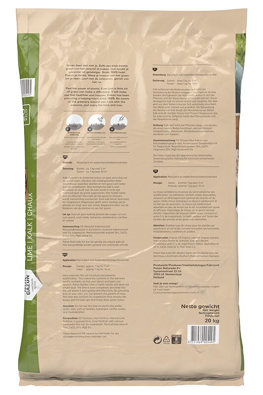 Kalk verbetert de bodemstructuur en gaat verzuring van de grond tegen. Hierdoor zijn voedingsstoffen beter beschikbaar, waardoor planten en het gazon goed kunnen ontwikkelen. Pokon Kalk is snel oplosbaar en stuift niet. Kalk wordt in korte tijd helemaal door de grond opgenomen. Het middel werkt snel en effectief.