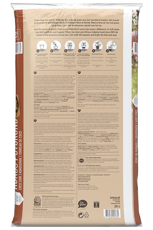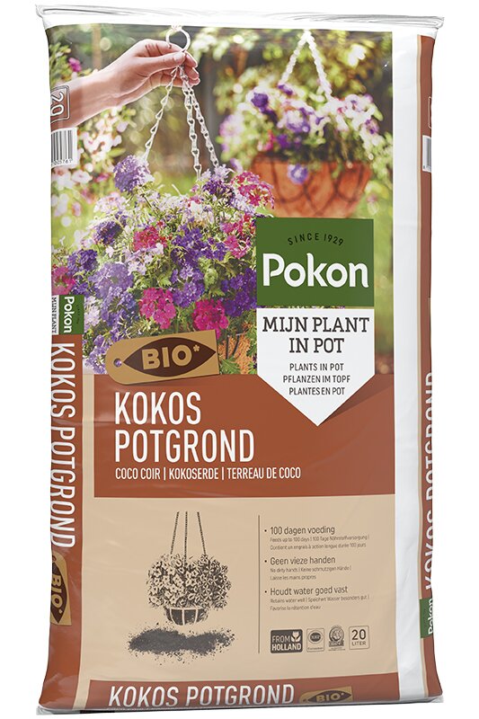 Deze Pokon Bio Kokos Potgrond is geschikt voor alle planten. Vooral in hanging baskets is de kokos potgrond erg handig omdat hij zo licht is. Pokon Bio Kokos Potgrond is 100% natuurlijk en daarom een pure en eerlijke basis voor je planten. De grond bestaat uit gecomposteerde kokosvezel, afkomstig van de zachte kokosbast. Je hoeft bovendien minder vaak water te geven doordat kokosvezels een zeer hoog waterhoudend vermogen hebben. Er zit voldoende voeding voor ca. 100 dagen.