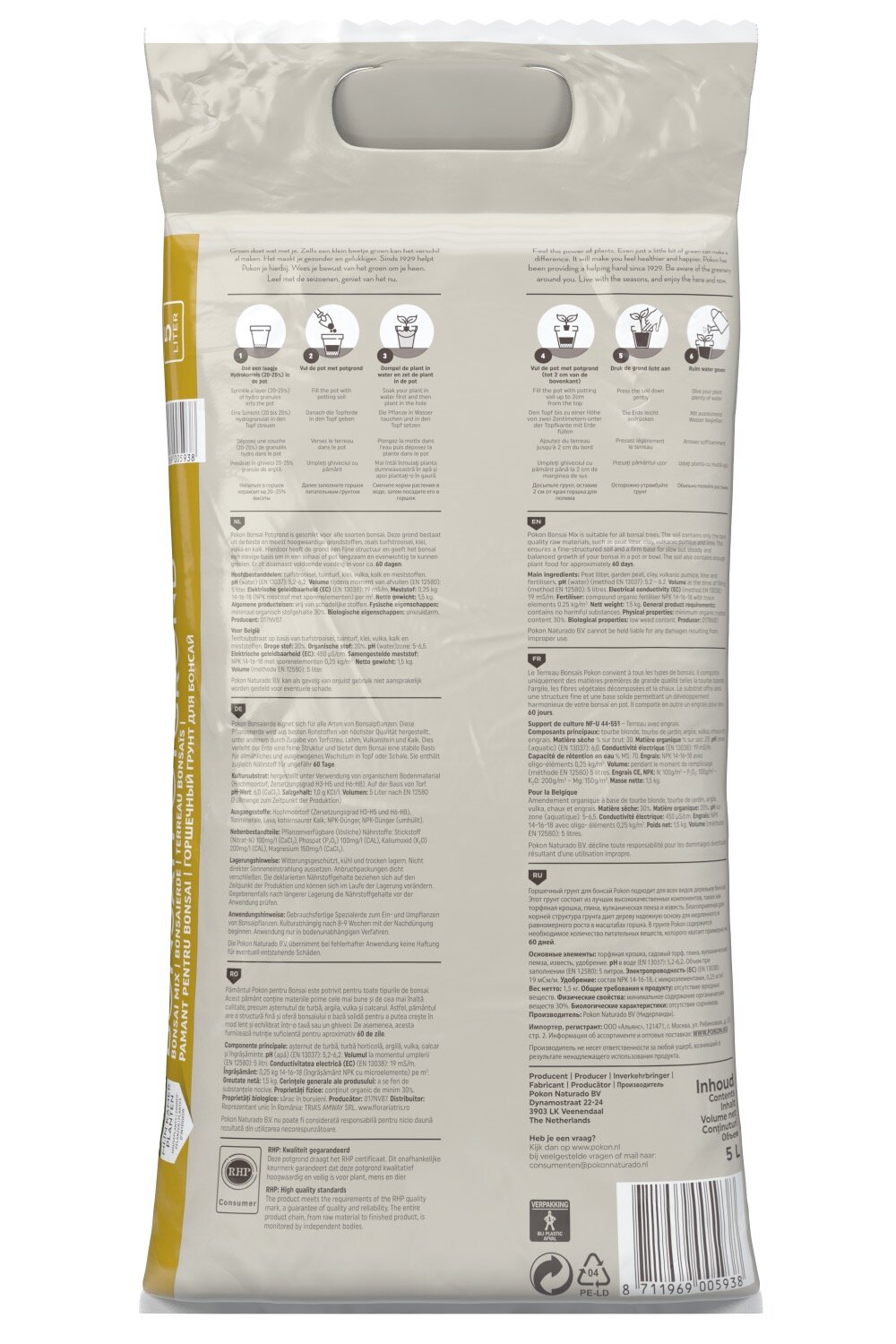 Pokon Potgrond Bonsai is geschikt voor alle soorten bonsai. Deze grond bestaat uit de beste en meest hoogwaardige grondstoffen, zoals turfstrooisel, klei, vulka en kalk. Hierdoor heeft de grond een fijne structuur en geeft het bonsai een stevige basis om in een schaal of pot langzaam en evenwichtig te kunnen groeien. Er zit daarnaast voldoende voeding in voor ca. 60 dagen.