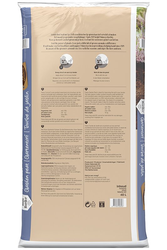 Pokon Tuinturf is een product waarmee je de structuur van de grond in je border kunt verbeteren. Door het hoge gehalte aan organische stof wordt de grond luchtiger, waardoor water beter wordt vastgehouden en een luchtige structuur ontstaat. Tuinturf, ook wel doorvroren zwartveen genoemd, is een 100% natuurproduct uit de diepste veenlagen. Door de lage pH-waarde is tuinturf uitermate geschikt voor planten die behoefte hebben aan zure grond, zoals heide, rododendrons en hortensia’s.