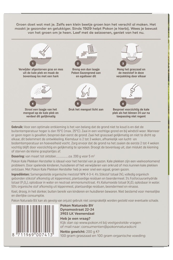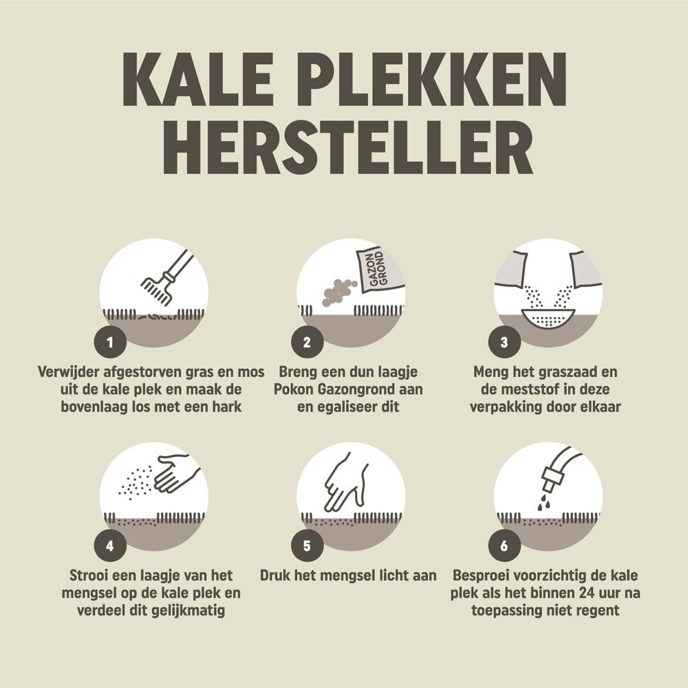 Verwijder afgestorven gras en mos uit de kale plek en maak de bovenlaag los met een hark. Breng een dun laagje Pokon Gazongrond aan en egaliseer dit. Meng het graszaad en de meststof in deze verpakking door elkaar. Strooi een laagje van het mengsel op de kale plek en verdeel dit gelijkmatig. Druk het mengsel licht aan. Besproei voorzichtig de kale plek als het binnen 24 uur na toepassing niet regent.