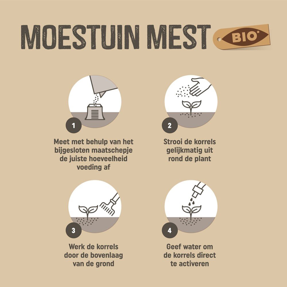 Deze biologische meststof is geschikt voor universeel gebruik in de moestuin. Pokon Bio Moestuin Mest is rijk aan kalium, wat zorgt voor sterke moestuinplanten met kwalitatief betere groenten en vruchten. Een goed bemeste bodem is een belangrijke voorwaarde voor een rijke oogst. Gezonde planten hebben meer weerstand tegen ziektes en plagen. Pokon Bio Moestuin Mest geeft tot 120 dagen voeding en geeft geen risico op verbranding. Pokon Bio Moestuin Mest kan in de maanden februari t/m augustus gebruikt worden. Voor het beste resultaat voed je je planten 2 keer per jaar, in het vroege voorjaar en in de zomer.