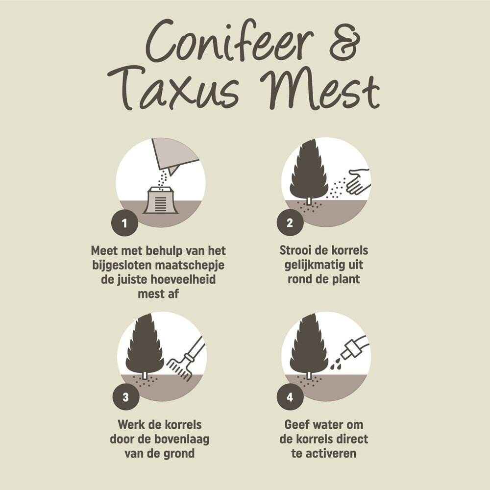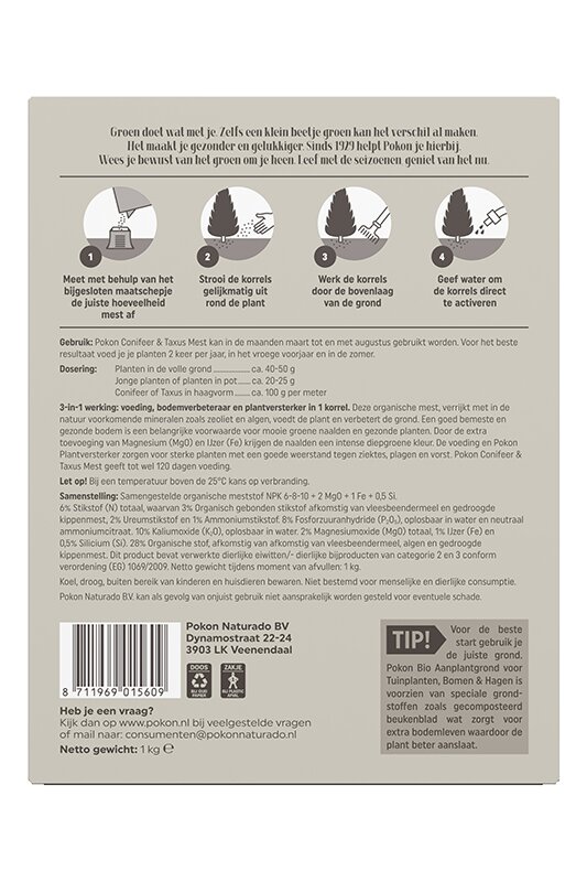 3-in-1 werking: voeding, bodemverbeteraar en plantversterker in 1 korrel. De organische mest van de Pokon Conifeer & Taxus Mest, verrijkt met in de natuur voorkomende mineralen zoals zeoliet en algen, voedt de plant en verbetert de grond. Een goed bemeste en gezonde bodem is een belangrijke voorwaarde voor mooie groene naalden en gezonde planten. Door de extra toevoeging van Magnesium (Mg0) en IJzer (Fe) krijgen de naalden een intense diepgroene kleur. De voeding en Pokon Plantenversterker zorgen voor sterke planten met een goede weerstand tegen ziektes, plagen en vorst. Pokon Conifeer & Taxus Mest geeft tot wel 120 dagen voeding. Pokon Conifeer & Taxus Mest kan in de maanden maart t/m augustus gebruikt worden. Voor het beste resultaat voed je je planten 2 keer per jaar, in het vroege voorjaar en in de zomer.