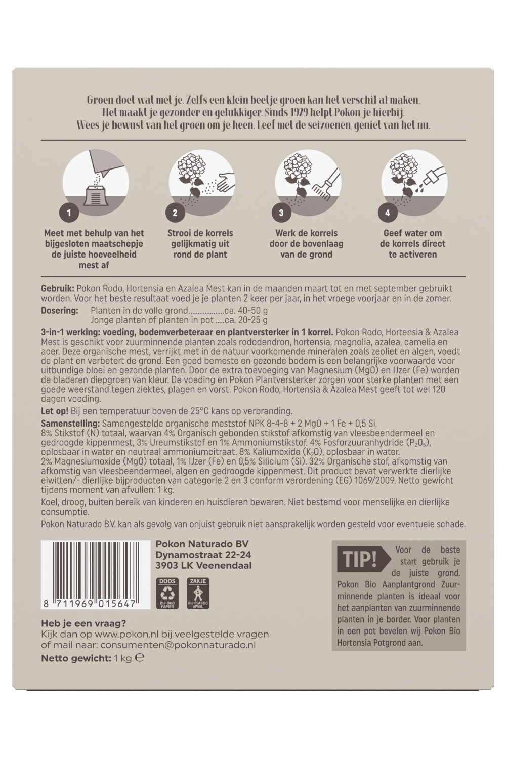3-in-1 werking: voeding, bodemverbeteraar en plantversterker in 1 korrel. Pokon Rodo, Hortensia & Azalea Mest is geschikt voor zuurminnende planten zoals rododendron, hortensia, magnolia, azalea, camelia en acer. Deze organische mest, verrijkt met in de natuur voorkomende mineralen zoals zeoliet en algen, voedt de plant en verbetert de grond. Een goed bemeste en gezonde bodem is een belangrijke voorwaarde voor uitbundige bloei en gezonde planten. Door de extra toevoeging van Magnesium (Mg0) en IJzer (Fe) worden de bladeren diepgroen van kleur. De voeding en Pokon Plantenversterker zorgen voor sterke planten met een goede weerstand tegen ziektes, plagen en vorst. Pokon Rodo, Hortensia en Azalea Mest geeft tot wel 120 dagen voeding. Pokon Rodo, Hortensia & Azalea Mest kan in de maanden maart t/m september gebruikt worden. Voor het beste resultaat voed je je planten 2 keer per jaar, in het vroege voorjaar en in de zomer.