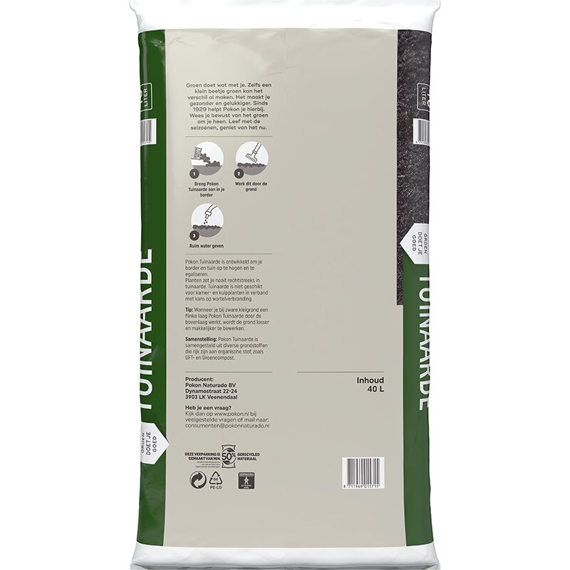 Pokon Tuinaarde is ontwikkeld om jouw border en tuin op te hogen en te egaliseren. Tuinaarde zorgt voor meer organische stof in de grond, waardoor wortels van jouw planten zich goed kunnen ontwikkelen. Zet jouw planten nooit rechtstreeks in tuinaarde, maar gebruik het in verband met kans op verbranding alleen om door de grond te mengen. Voor de aanplant van tuinplanten adviseren wij om Tuinplanten Aanplantgrond of een specifieke grond, zoals Rozen grond, te gebruiken. Pokon Tuinaarde is samengesteld uit diverse grondstoffen die rijk zijn aan organische stof, zoals tuinturf en voedingstoffen.