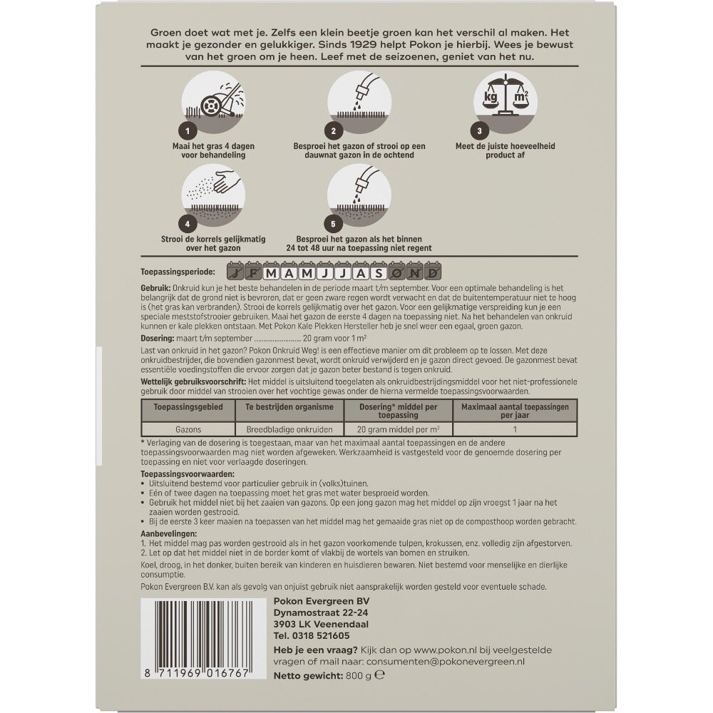 Last van onkruid in je gazon? Pokon Onkruid Weg! is een effectieve manier om dit probleem op te lossen. Met deze onkruidbestrijder, die bovendien gazonmest bevat, wordt onkruid snel verwijderd en je gazon direct gevoed. De werkzame stoffen in dit product veroorzaken een oncontroleerbare groei van onkruiden. De bladeren gaan opkrullen en uiteindelijk verwelkt en sterft het onkruid af tot in de wortel. Het gras van de behandelde plekken kan door de aanwezige meststof ook sneller gaan groeien, waardoor er mogelijk kleurverschil kan ontstaan. Het kleurverschil verdwijnt in de loop van tijd. De essentiële voedingsstoffen in deze gazonmest zorgen ervoor dat je gazon beter bestand is tegen onkruid. Onkruid kun je het beste behandelen in de periode maart t/m september. Voor een optimale behandeling is het belangrijk dat de grond niet is bevroren, dat er geen zware regen wordt verwacht en dat de buitentemperatuur niet te hoog is (het gras kan verbranden). Maai het gazon de eerste 4 dagen na toepassing niet.