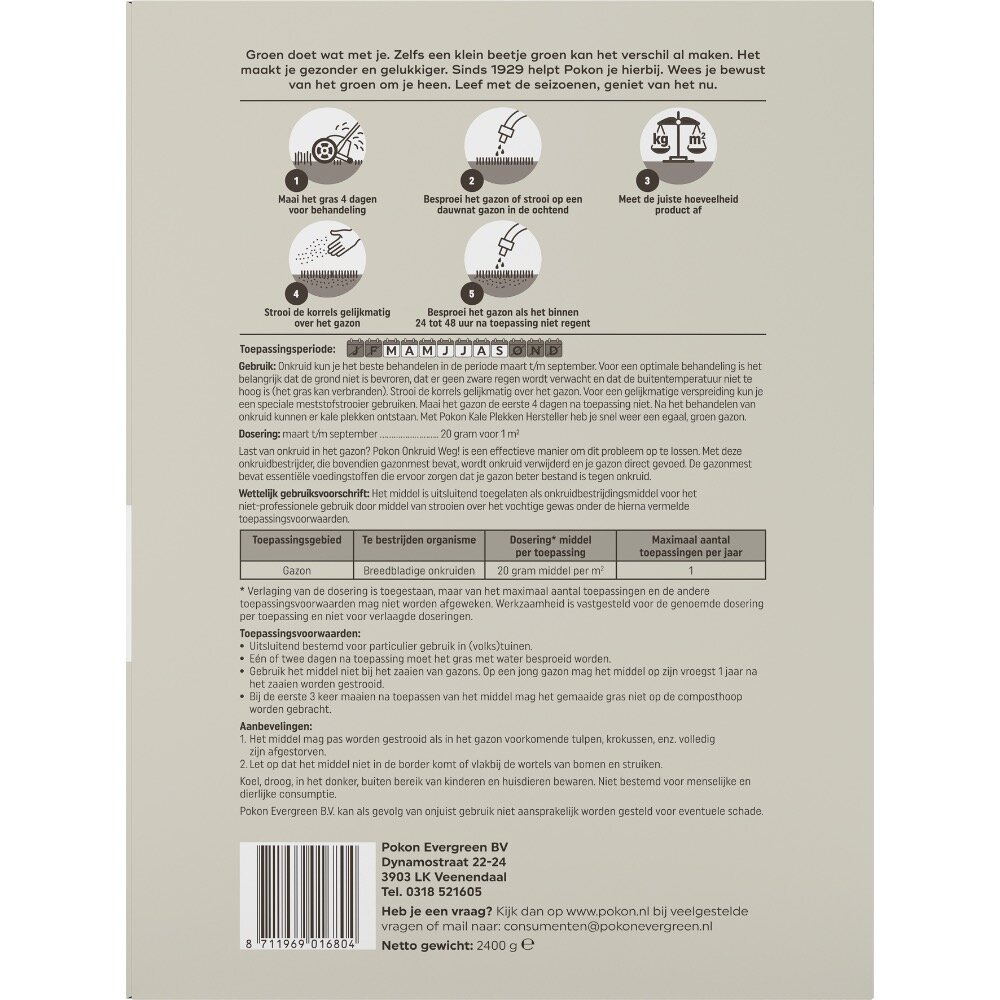 Last van onkruid in je gazon? Pokon Onkruid Weg! is een effectieve manier om dit probleem op te lossen. Met deze onkruidbestrijder, die bovendien gazonmest bevat, wordt onkruid snel verwijderd en je gazon direct gevoed. De werkzame stoffen in dit product veroorzaken een oncontroleerbare groei van onkruiden. De bladeren gaan opkrullen en uiteindelijk verwelkt en sterft het onkruid af tot in de wortel. Het gras van de behandelde plekken kan door de aanwezige meststof ook sneller gaan groeien, waardoor er mogelijk kleurverschil kan ontstaan. Het kleurverschil verdwijnt in de loop van tijd. De essentiële voedingsstoffen in deze gazonmest zorgen ervoor dat je gazon beter bestand is tegen onkruid. Onkruid kun je het beste behandelen in de periode maart t/m september. Voor een optimale behandeling is het belangrijk dat de grond niet is bevroren, dat er geen zware regen wordt verwacht en dat de buitentemperatuur niet te hoog is (het gras kan verbranden). Maai het gazon de eerste 4 dagen na toepassing niet.