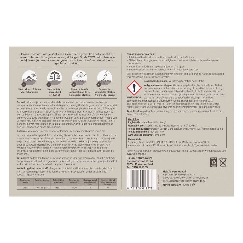 Last van mos in het gazon? Pokon Mos Weg! is een effectieve manier om dit probleem op te lossen. Met deze mosbestrijder, die bovendien gazonmest bevat, wordt mos snel verwijderd en je gazon direct gevoed. De gazonmest bevat essentiële voedingsstoffen die ervoor zorgen dat het gazon beter bestand is tegen mos. Mos kun je het beste behandelen van maart t/m mei en van september t/m december (niet in de zomer toepassen). Voor een optimale behandeling is het belangrijk dat de grond niet bevroren is, dat er geen zware regen wordt verwacht en dat de buitentemperatuur niet te hoog is (het gras kan verbranden). Maai het gazon de eerste 4 dagen na toepassing niet. Binnen een week zal het mos zwart/bruin worden en afsterven. Na twee weken kan het dode mos worden verwijderd, bij voorkeur door middel van verticuteren. Indien noodzakelijk kan de behandeling na 90 dagen worden herhaald.