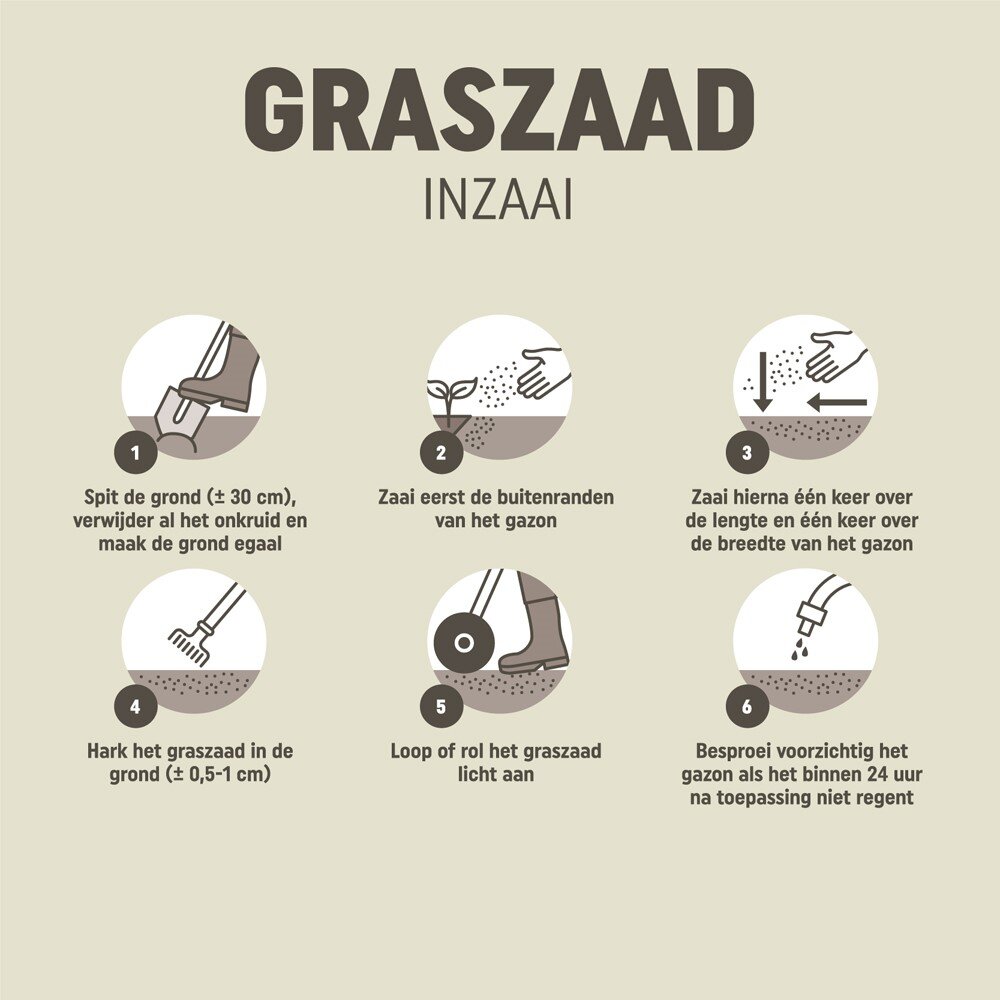 Spit de grond (30 cm), verwijder al het onkruid en maak de grond egaal. Zaai eerst de buitenranden van het gazon. Zaai hierna één keer over de lengte en één keer over de breedte van het gazon. Hark het graszaad in de grond (0,5-1 cm). Loop of rol het graszaad licht aan. Besproei voorzichtig het gazon als het binnen 24 uur na toepassing niet regent.
