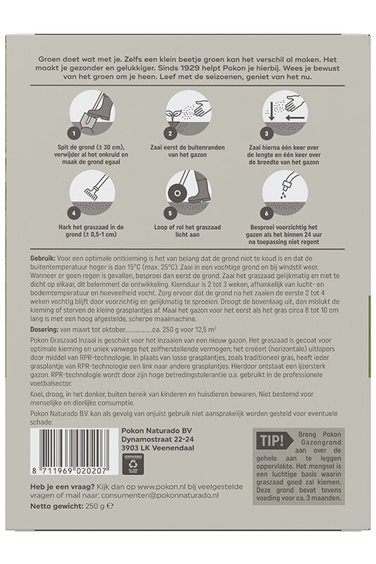 Pokon Graszaad Inzaai is geschikt voor het inzaaien van een nieuw gazon. Het graszaad is gecoat voor optimale kieming en uniek vanwege het zelfherstellende vermogen; het creëert (horizontale) uitlopers door middel van RPR-technologie. In plaats van losse grasplantjes, zoals traditioneel gras, heeft ieder grasplantje van RPR-technologie een link naar andere grasplantjes. Hierdoor ontstaat een ijzersterk gazon, RPR-technologie wordt door zijn betredingstolerantie o.a. gebruikt in de professionele voetbalsector. Voor een optimale ontkieming is het van belang dat de grond niet te koud is en dat de buitentemperatuur hoger is dan 15°C (max. 25°C). Zaai in een vochtige grond en bij windstil weer. Wanneer er geen regen is gevallen, besproei dan eerst de grond. Zaai het graszaad gelijkmatig en niet te dicht op elkaar, dit belemmert de ontwikkeling. Kiemduur is 2 tot 3 weken, afhankelijk van lucht- en bodemtemperatuur en hoeveelheid vocht. Zorg ervoor dat de grond na het zaaien de eerste 2 tot 4 weken vochtig blijft door voorzichtig en gelijkmatig te sproeien. Droogt de bovenlaag uit, dan mislukt de kieming of sterven de kleine grasplantjes af. Maai het gazon voor het eerst als het gras circa 8 tot 10 cm lang is met een hoog afgestelde, scherpe maaimachine.
