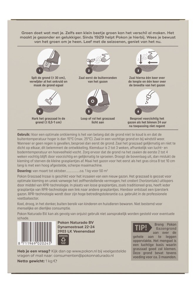 Pokon Graszaad Inzaai is geschikt voor het inzaaien van een nieuw gazon. Het graszaad is gecoat voor optimale kieming en uniek vanwege het zelfherstellende vermogen; het creëert (horizontale) uitlopers door middel van RPR-technologie. In plaats van losse grasplantjes, zoals traditioneel gras, heeft ieder grasplantje van RPR-technologie een link naar andere grasplantjes. Hierdoor ontstaat een ijzersterk gazon, RPR-technologie wordt door zijn betredingstolerantie o.a. gebruikt in de professionele voetbalsector. Voor een optimale ontkieming is het van belang dat de grond niet te koud is en dat de buitentemperatuur hoger is dan 15°C (max. 25°C). Zaai in een vochtige grond en bij windstil weer. Wanneer er geen regen is gevallen, besproei dan eerst de grond. Zaai het graszaad gelijkmatig en niet te dicht op elkaar, dit belemmert de ontwikkeling. Kiemduur is 2 tot 3 weken, afhankelijk van lucht- en bodemtemperatuur en hoeveelheid vocht. Zorg ervoor dat de grond na het zaaien de eerste 2 tot 4 weken vochtig blijft door voorzichtig en gelijkmatig te sproeien. Droogt de bovenlaag uit, dan mislukt de kieming of sterven de kleine grasplantjes af. Maai het gazon voor het eerst als het gras circa 8 tot 10 cm lang is met een hoog afgestelde, scherpe maaimachine.