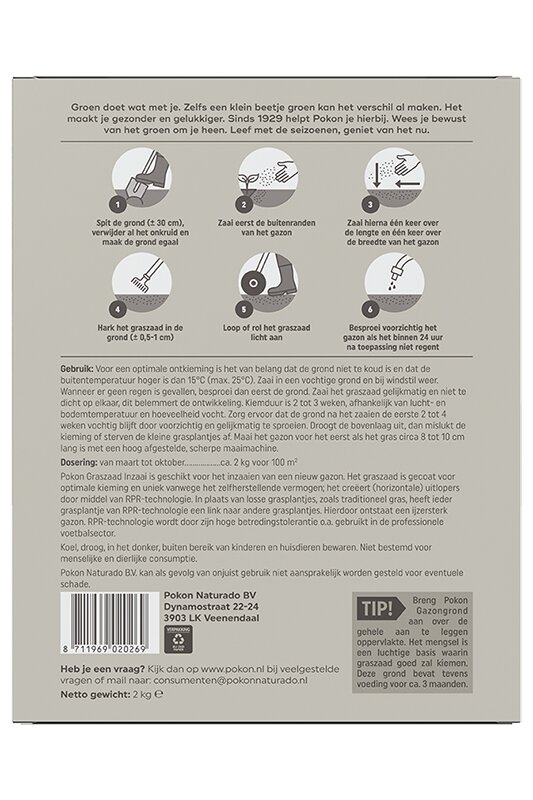 Pokon Graszaad Inzaai is geschikt voor het inzaaien van een nieuw gazon. Het graszaad is gecoat voor optimale kieming en uniek vanwege het zelfherstellende vermogen; het creëert (horizontale) uitlopers door middel van RPR-technologie. In plaats van losse grasplantjes, zoals traditioneel gras, heeft ieder grasplantje van RPR-technologie een link naar andere grasplantjes. Hierdoor ontstaat een ijzersterk gazon, RPR-technologie wordt door zijn betredingstolerantie o.a. gebruikt in de professionele voetbalsector. Voor een optimale ontkieming is het van belang dat de grond niet te koud is en dat de buitentemperatuur hoger is dan 15°C (max. 25°C). Zaai in een vochtige grond en bij windstil weer. Wanneer er geen regen is gevallen, besproei dan eerst de grond. Zaai het graszaad gelijkmatig en niet te dicht op elkaar, dit belemmert de ontwikkeling. Kiemduur is 2 tot 3 weken, afhankelijk van lucht- en bodemtemperatuur en hoeveelheid vocht. Zorg ervoor dat de grond na het zaaien de eerste 2 tot 4 weken vochtig blijft door voorzichtig en gelijkmatig te sproeien. Droogt de bovenlaag uit, dan mislukt de kieming of sterven de kleine grasplantjes af. Maai het gazon voor het eerst als het gras circa 8 tot 10 cm lang is met een hoog afgestelde, scherpe maaimachine.
