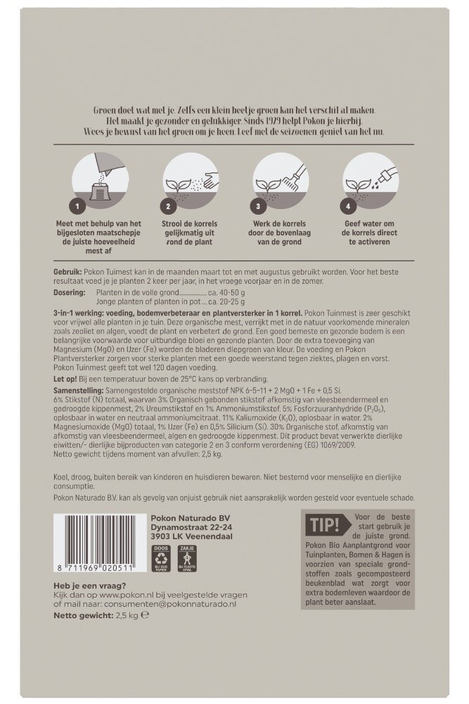 3-in-1 werking: voeding, bodemverbeteraar en plantversterker in 1 korrel. Pokon Tuinmest is zeer geschikt voor vrijwel alle planten in je tuin. Deze organische mest, verrijkt met in de natuur voorkomende mineralen zoals zeoliet en algen, voedt de plant en verbetert de grond. Een goed bemeste en gezonde bodem is een belangrijke voorwaarde voor uitbundige bloei en gezonde planten. Door de extra toevoeging van Magnesium (Mg0) en IJzer (Fe) worden de bladeren diepgroen van kleur. De voeding en Pokon Plantenversterker zorgen voor sterke planten met een goede weerstand tegen ziektes, plagen en vorst. Pokon Tuinmest geeft tot wel 120 dagen voeding. Pokon Tuinmest kan in de maanden maart t/m augustus gebruikt worden. Voor het beste resultaat voed je je planten 2 keer per jaar, in het vroege voorjaar en in de zomer.
