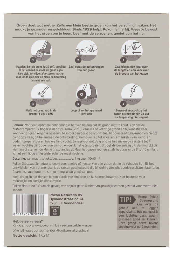 Pokon Graszaad Schaduw is ideaal voor aanleg of herstel van een gazon dat in de schaduw ligt. Bij het ontwikkelen van het mengsel is op rassen geselecteerd die bij weinig zonlicht goede resultaten laten zien. Daarnaast voorkomt het sterke mengsel de groei van mos. Voor een optimale kieming is het van belang dat de grond niet te koud is en dat de buitentemperatuur hoger is dan 15°C (max. 25°C). Zaai in een vochtige grond en bij windstil weer. Wanneer er geen regen is gevallen, besproei dan eerst de grond. Zaai het graszaad gelijkmatig en niet te dicht op elkaar, dit belemmert de ontwikkeling. Kiemduur is 3 tot 4 weken, afhankelijk van lucht- en bodemtemperatuur en hoeveelheid vocht. Zorg ervoor dat de grond na het zaaien de eerste 2 tot 4 weken vochtig blijft door voorzichtig en gelijkmatig te sproeien. Droogt de bovenlaag uit, dan mislukt de kieming of sterven de kleine grasplantjes af. Maai het gazon voor het eerst als het gras circa 8 tot 10 cm lang is met een hoog afgestelde, scherpe maaimachine.
